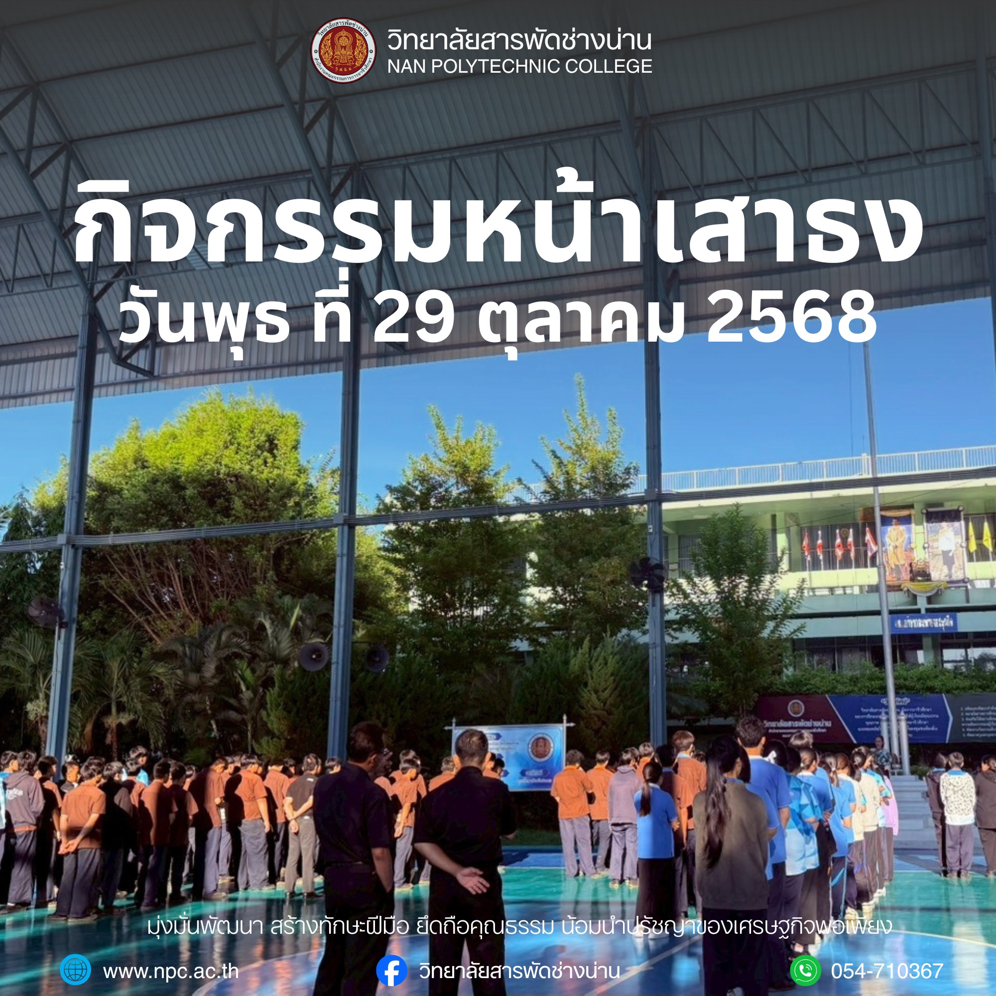วันพุธ ที่ 29 ตุลาคม 2568 ฝ่ายบริหาร คณะครูเวรประจำวัน ต้อนรับนักเรียน นักศึกษา หน้าประตูวิทยาลัยฯ ทางเข้า - ทางออก และกิจกรรมหน้าเสาธง