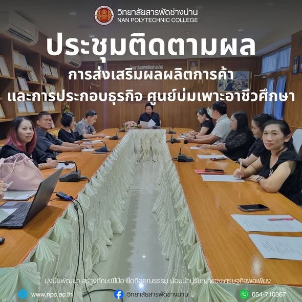 นายนิพนธ์ ร่องพืช รองผู้อำนวยการวิทยาลัยสารพัดช่างน่าน พร้อมด้วยครูที่ปรึกษาธุรกิจใหม่ที่ได้รับการส่งเสริมจากศูนย์บ่มเพาะผู้ประกอบการอาชีวศึกษา จำนวน 3 ธุรกิจ และธุรกิจที่ดำเนินการต่อเนื่อง (ดำเนินการมาแล้วมากกว่า 1 ปีการศึกษาขึ้นไป) จำนวน 2 ธุรกิจ เข้าร่วมประชุมเพื่อติดตามความคืบหน้าในการดำเนินของแต่ละธุรกิจ ในภาคเรียนที่ 2/2568 ณ ห้องประชุมเกียรติยศ อาคารวิทยบริการ วิทยาลัยสารพัดช่างน่าน