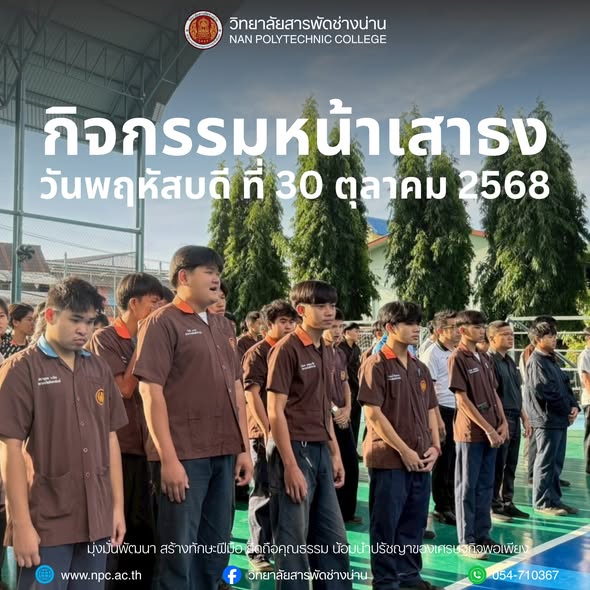 วันพฤหัสบดี ที่ 30 ตุลาคม 2568 ฝ่ายบริหาร คณะครูเวรประจำวัน ต้อนรับนักเรียน นักศึกษา หน้าประตูวิทยาลัยฯ ทางเข้า - ทางออก และกิจกรรมหน้าเสาธง