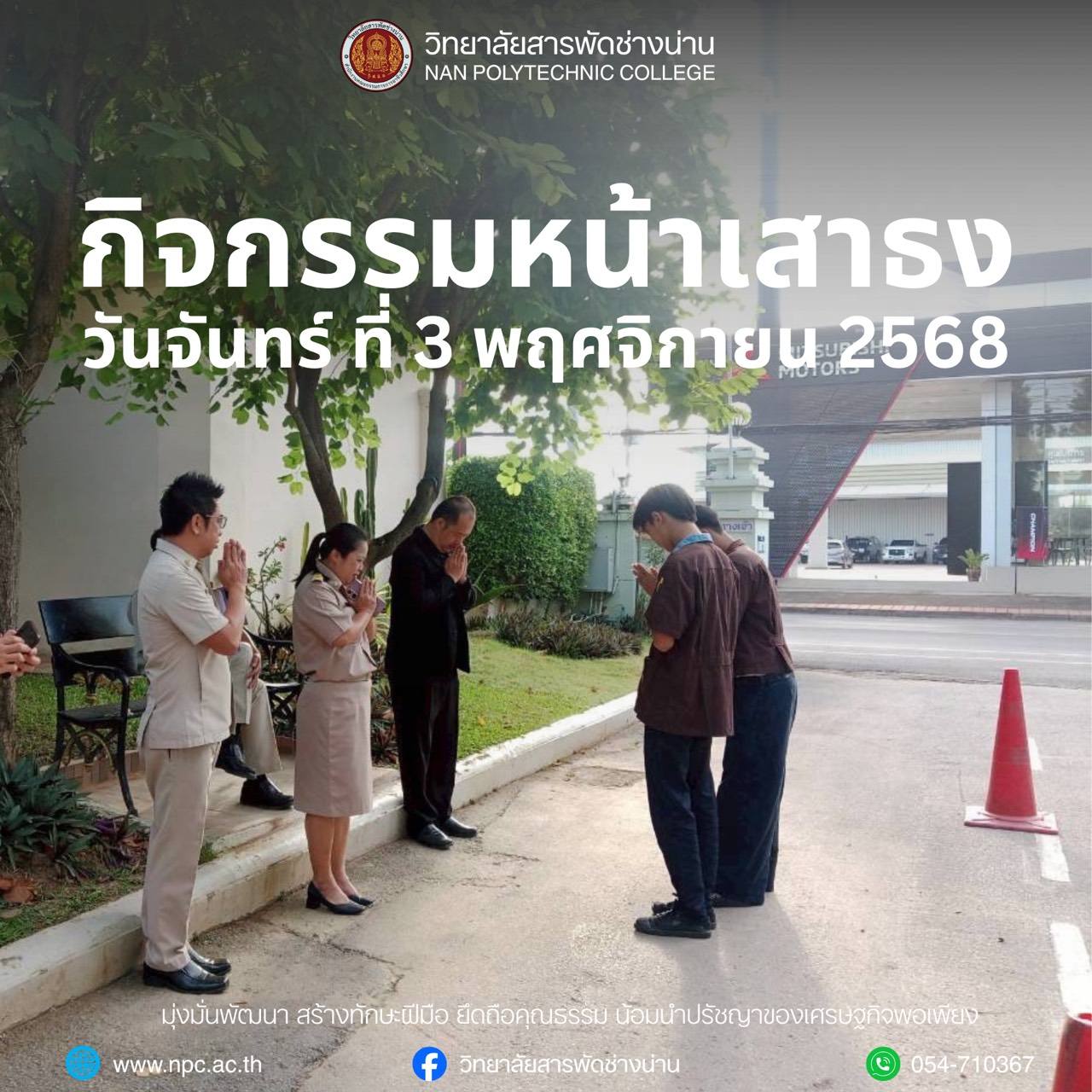 วันจันทร์ ที่ 3 พฤศจิกายน 2568 ฝ่ายบริหาร คณะครูเวรประจำวัน ต้อนรับนักเรียน นักศึกษา หน้าประตูวิทยาลัยฯ ทางเข้า - ทางออก และกิจกรรมหน้าเสาธง