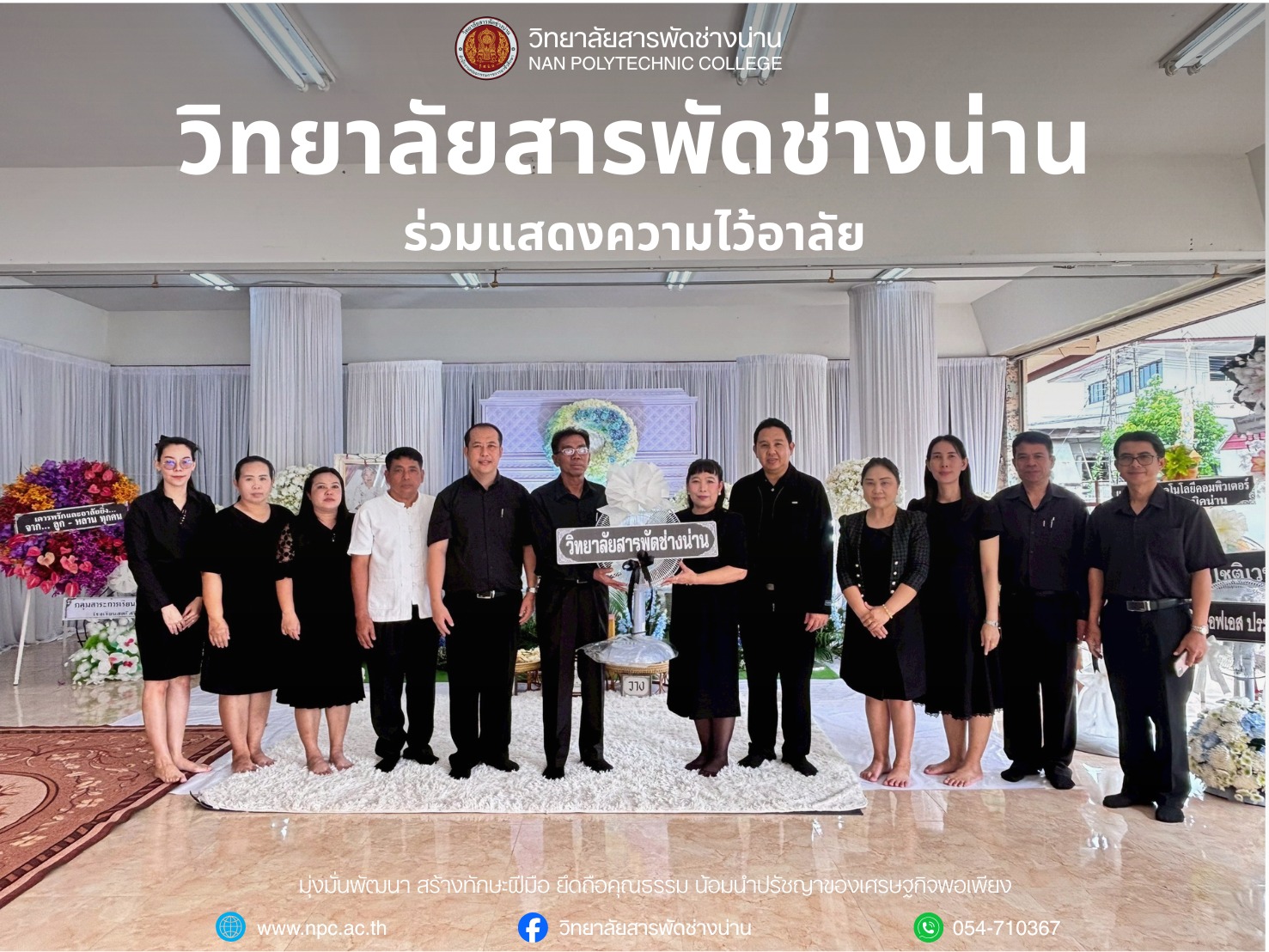 วิทยาลัยสารพัดช่างน่าน ร่วมแสดงความอาลัย นายจักรพงศ์ พรหมสกุลปัญญา รองผู้อำนวยการรักษา การในตำแหน่ง ผู้อำนวยการวิทยาลัยสารพัดช่างน่าน พร้อมด้วยคณะผู้บริหาร ครูและเจ้าหน้าที่ ร่วมวางพวงหรีดแสดงความอาลัยต่อการจากไปของ มารดาท่านรองวัฒนาพร ไชยวงค์ รองผู้อำนวยการวิทยาลัยเทคนิคน่าน ณ วัดสวนตาล จังหวัดน่าน ขอแสดงความเสียใจอย่างสุดซึ้งต่อท่านรองวัฒนาพร และครอบครัวมา ณ โอกาสนี้