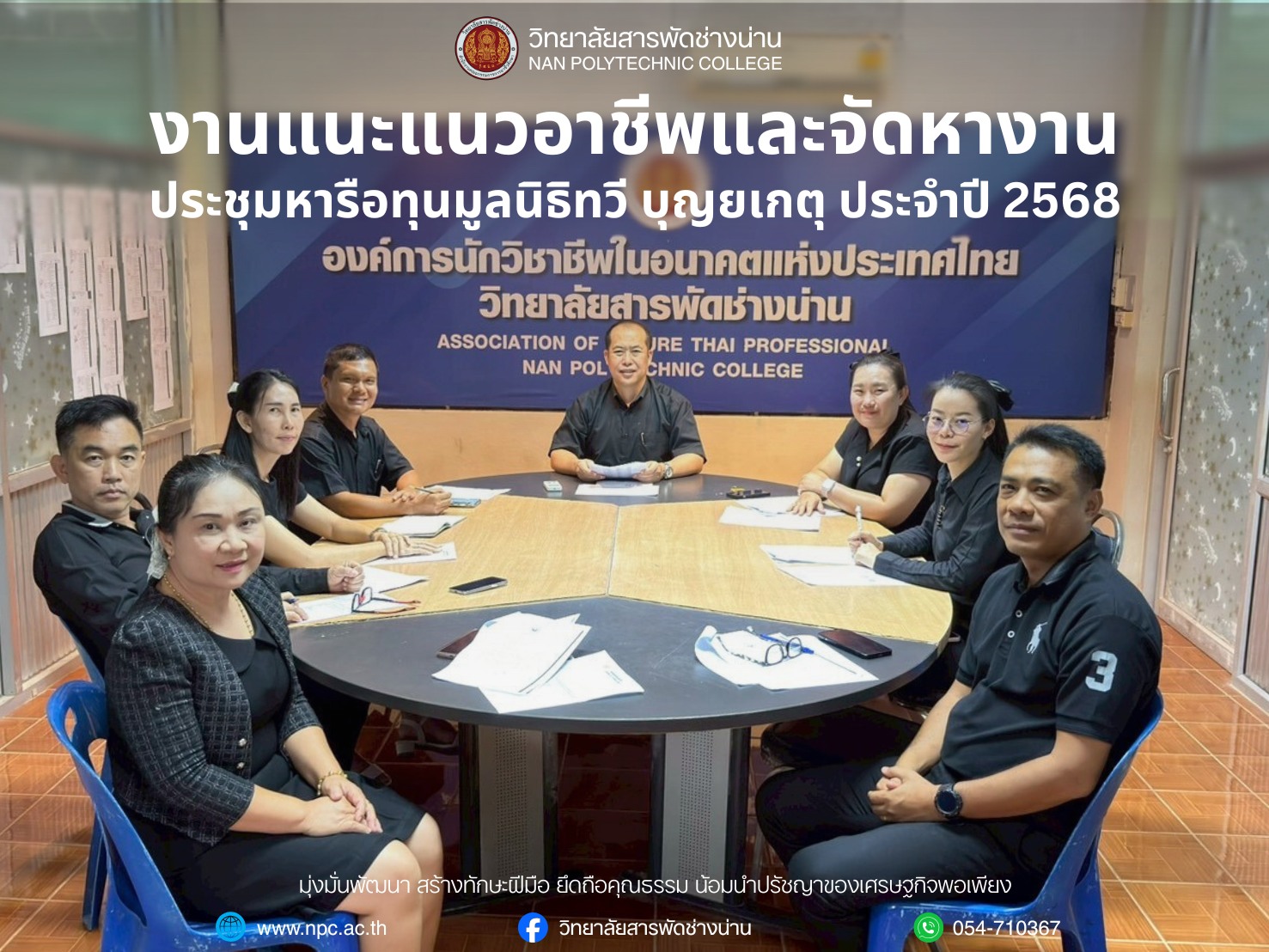วันอังคารที่ 4 พฤศจิกายน 2568 งานแนะแนวอาชีพและจัดหางาน วิทยาลัยสารพัดช่างน่าน ได้จัดประชุมหารือเกี่ยวกับ ทุนการศึกษามูลนิธิทวี บุญยเกตุ ประจำปี 2568 ณ ห้องประชุม อวท. วิทยาลัยสารพัดช่างน่าน การประชุมครั้งนี้มีวัตถุประสงค์เพื่อพิจารณาหลักเกณฑ์และแนวทางการเสนอชื่อผู้เรียนที่มีคุณสมบัติเหมาะสม เพื่อรับทุนการศึกษาจากมูลนิธิทวี บุญยเกตุ ซึ่งเป็นทุนที่มุ่งส่งเสริมและสนับสนุนผู้เรียนในสังกัดสำนักงานคณะกรรมการการอาชีวศึกษา ให้มีโอกาสศึกษาต่อและพัฒนาศักยภาพทางการศึกษาอย่างเต็มที่