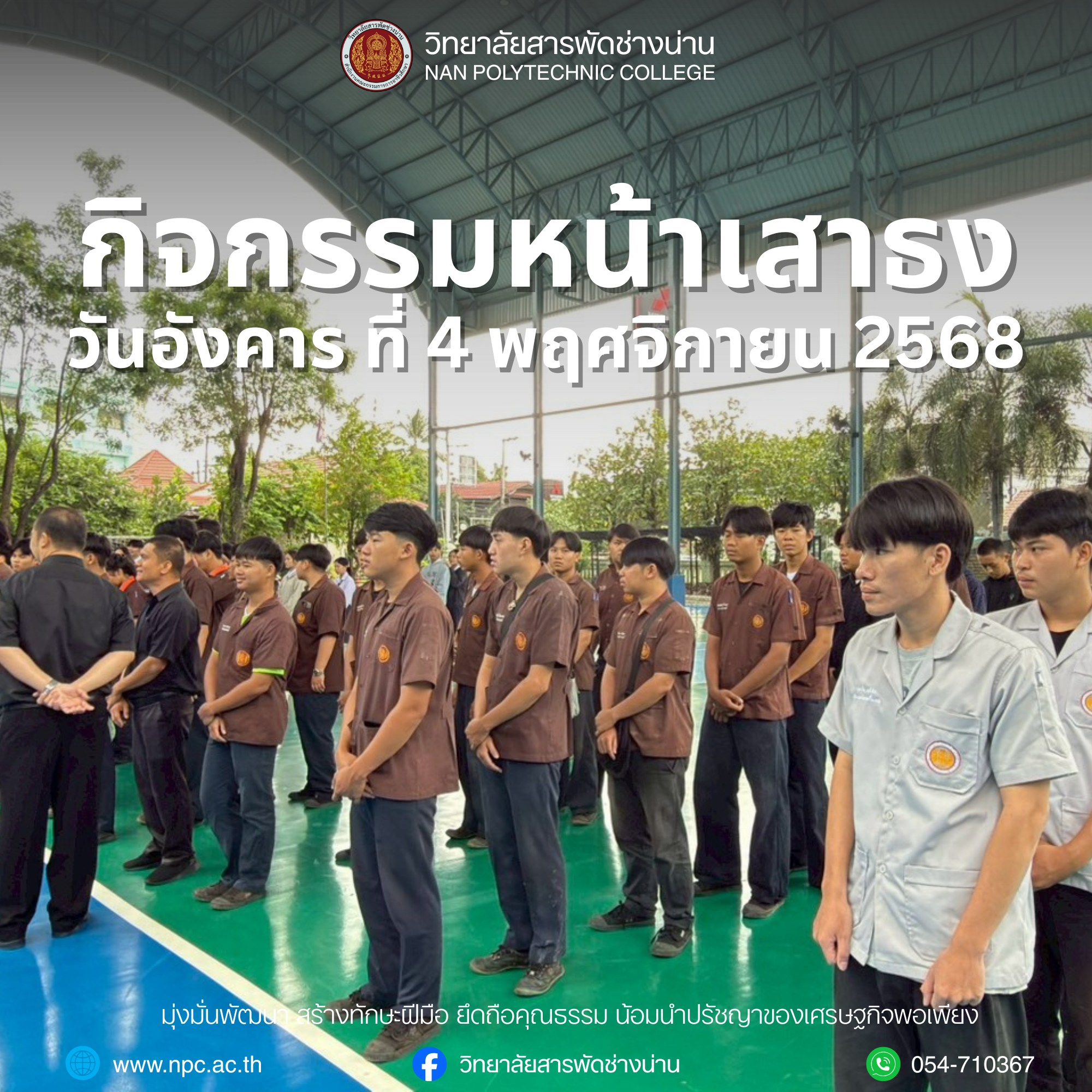 วันอังคาร ที่ 4 พฤศจิกายน 2568 ฝ่ายบริหาร คณะครูเวรประจำวัน ต้อนรับนักเรียน นักศึกษา หน้าประตูวิทยาลัยฯ ทางเข้า - ทางออก และกิจกรรมหน้าเสาธง