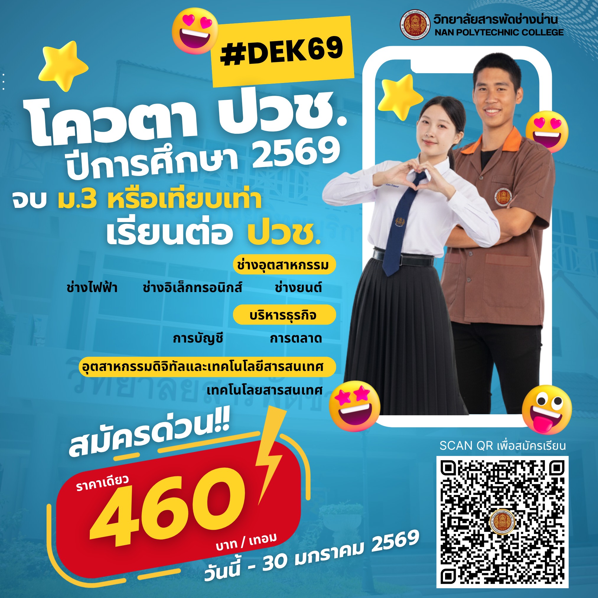 หรือสมัครได้ที่ #วิทยาลัยสารพัดช่างน่าน จันทร์ - ศุกร์ ในเวลาทำการ