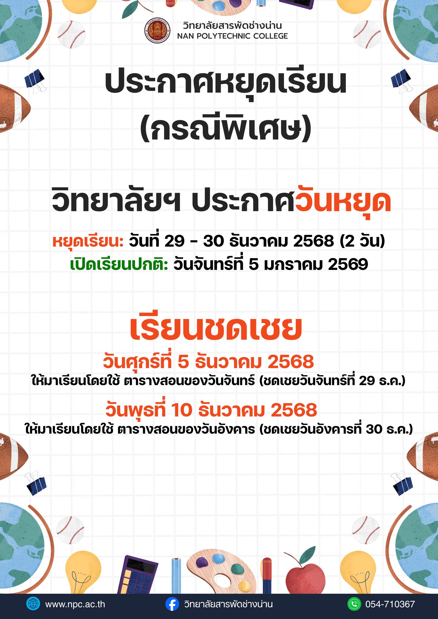 เช็กด่วน! วันหยุดปีใหม่ & ตารางเรียนชดเชย วิทยาลัยสารพัดช่างน่าน ขอแจ้งกำหนดการหยุดเรียนกรณีพิเศษ (ช่วงเทศกาลปีใหม่) และกำหนดการเรียนชดเชย ดังนี้