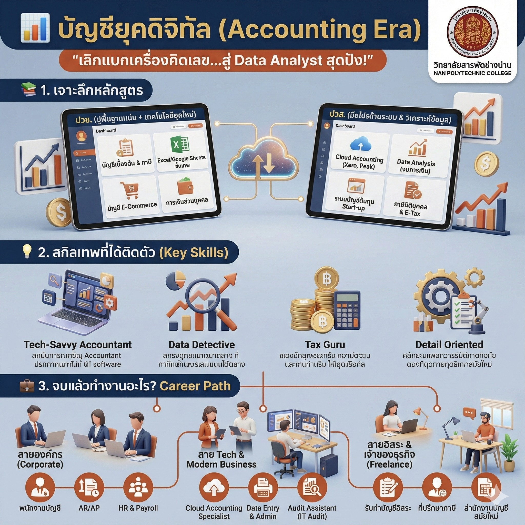 หยุดความคิดเดิมๆ ว่าจบบัญชีต้องนั่งกดเครื่องคิดเลข! ยุคนี้ถ้าไม่ปรับ...คือ "จบ" โลกเปลี่ยนไปแล้ว! AI มา, E-Commerce บูม... คุณยังจะเป็นแค่นักบัญชีที่ลงบันทึกรับ-จ่ายอยู่เหรอ? ได้เวลาอัปเกรดสู่ "บัญชียุคดิจิทัล (Accounting Era)" ที่ วิทยาลัยสารพัดช่างน่าน เปลี่ยนจากคนทำบัญชีธรรมดา ให้เป็น "Data Analyst" สุดปัง! ผู้มองเห็นอนาคตธุรกิจผ่านตัวเลข เลิกแบกเครื่องคิดเลข: เรียนรู้การใช้ Cloud Accounting (Xero, Peak) และ Excel ขั้นเทพ สกิลที่ AI แย่งงานไม่ได้: ฝึกการวิเคราะห์ Data, เป็นที่ปรึกษาภาษียุคใหม่ และความละเอียดรอบคอบที่หุ่นยนต์ไม่มี จบแล้วเนื้อหอมมาก: ตลาดต้องการตัวสุดๆ ไม่ว่าจะสายองค์กร, สาย Tech หรือจะเป็นนายตัวเองรับงาน Freelance ชิลๆ ก็ทำได้! อย่าปล่อยให้โอกาสหลุดมือ อนาคตนักบัญชีสาย Tech รอคุณอยู่! สมัครได้ตั้งแต่วันนี้ - 30 มกราคม 2569 คลิกลิงค์ได้เลย https://shorturl.asia/pOt0J หรือสมัครได้ที่ #วิทยาลัยสารพัดช่างน่าน จันทร์ - ศุกร์ ในเวลาทำการ วิทยาลัยสารพัดช่างน่าน วิทยาลัยสำหรับปวงชน พร้อมนำทุกคนพัฒนาเพื่ออนาคตที่สดใส