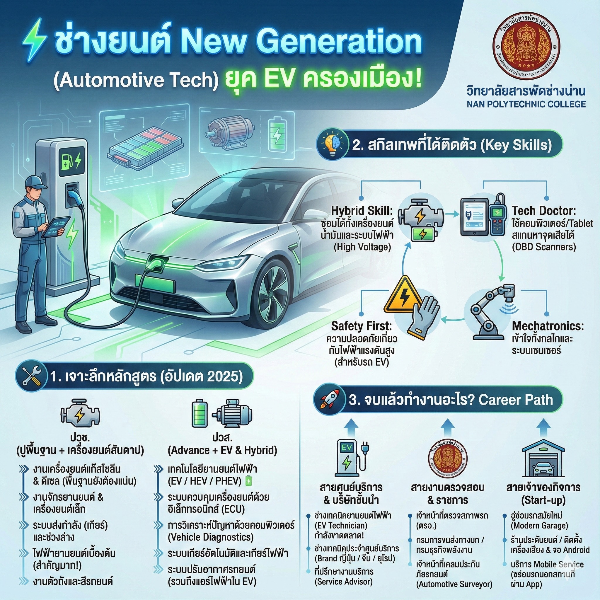 เปิดวาร์ป 3 เส้นทางรุ่ง! ของ "เด็กช่างยนต์ New Gen" จบแล้วไปไหนได้บ้าง? ใครว่าเรียนช่างยนต์ต้องอยู่แต่อู่? คิดใหม่ได้เลย! ที่ วิทยาลัยสารพัดช่างน่าน เราปั้นให้คุณเป็นมากกว่าช่างซ่อม! มาดูกันว่าหลักสูตรสุด High-Tech ของเรา จะพาคุณไปสู่อาชีพอะไรได้บ้าง?
