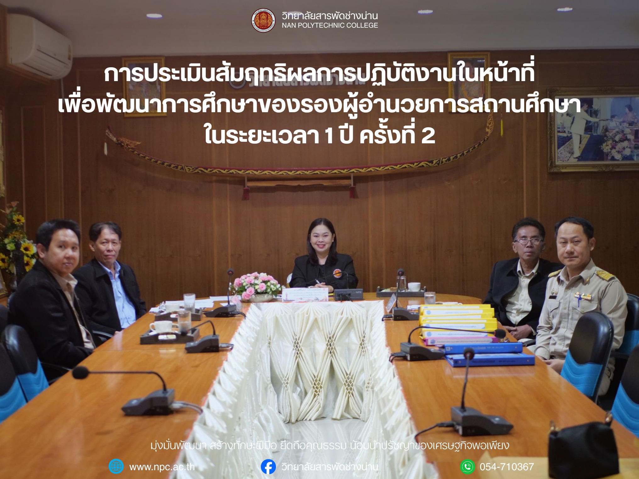 วิทยาลัยสารพัดช่างน่าน ประเมินสัมฤทธิผลรองผู้อำนวยการ ครั้งที่ 2 เพื่อยกระดับการบริหารศึกษา วันที่ 1 ธันวาคม 2568 วิทยาลัยสารพัดช่างน่าน จัดการประเมินสัมฤทธิผลการปฏิบัติงานของรองผู้อำนวยการสถานศึกษา ระยะเวลา 1 ปี ครั้งที่ 2 โดยมี ดร.ศศิรินทร์ มหาวงศนันท์ ผู้อำนวยการวิทยาลัยการอาชีพเวียงสา รักษาการผู้อำนวยการสำนักงานอาชีวศึกษาจังหวัดน่าน ให้เกียรติเป็นประธานในการประเมิน พร้อมด้วย ดร.จิรวัฒน์ ชินศรี ผู้ทรงคุณวุฒิ และ นายจักรพงศ์ พรหมสกุลปัญญา รองผู้อำนวยการ รักษาการในตำแหน่งผู้อำนวยการวิทยาลัยสารพัดช่างน่าน ร่วมดำเนินการประเมิน การประเมินครั้งนี้จัดขึ้นเพื่อทบทวนผลการปฏิบัติงานและพัฒนาศักยภาพในการบริหารงานของ นายนิพนธ์ ร่องพิช รองผู้อำนวยการวิทยาลัยสารพัดช่างน่าน ตลอดระยะเวลา 1 ปีที่ผ่านมา โดยพิจารณาจากผลการปฏิบัติงานจริง การบริหารจัดการงานในหน้าที่ และการขับเคลื่อนคุณภาพการศึกษาในภาพรวม กิจกรรมดังกล่าวจัดขึ้น ณ ห้องประชุมเกียรติยศ อาคารวิทยบริการ วิทยาลัยสารพัดช่างน่าน ในบรรยากาศเป็นทางการและเป็นกันเอง มุ่งยกระดับคุณภาพบุคลากรและสร้างมาตรฐานการบริหารงานที่โปร่งใส มีประสิทธิภาพ และสอดคล้องตามนโยบายของสำนักงานคณะกรรมการการอาชีวศึกษา