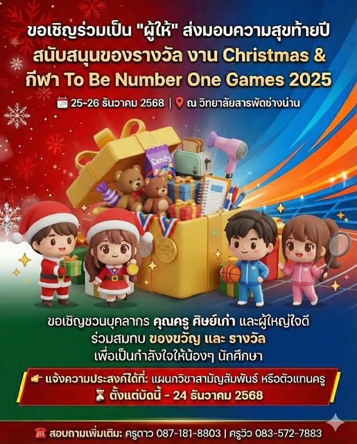 วิทยาลัยสารพัดช่างน่านจัดกิจกรรมเชิญชวนบุคลากร ศิษย์เก่า ครู และผู้มีจิตศรัทธา ร่วมสมทบ ของขวัญและของรางวัล เพื่อส่งต่อความสุขให้แก่นักศึกษา เนื่องในงาน Christmas & กีฬา To Be Number One Games 2025 ซึ่งจะจัดขึ้นในวันที่ 25–26 ธันวาคม 2568 ณ วิทยาลัยสารพัดช่างน่าน กิจกรรมครั้งนี้มีเป้าหมายเพื่อสร้างรอยยิ้ม ความสุข และกำลังใจให้นักศึกษาตลอดช่วงท้ายปี ผ่านกิจกรรมกีฬา กิจกรรมสร้างสรรค์ และการมอบของรางวัลต่าง ๆ โดยเปิดรับของขวัญจากผู้ใหญ่ใจดีทุกภาคส่วน ไม่ว่าจะเป็นบุคลากรในวิทยาลัย ครูผู้สอน ตลอดจนศิษย์เก่าและผู้สนับสนุนภายนอก ![]()