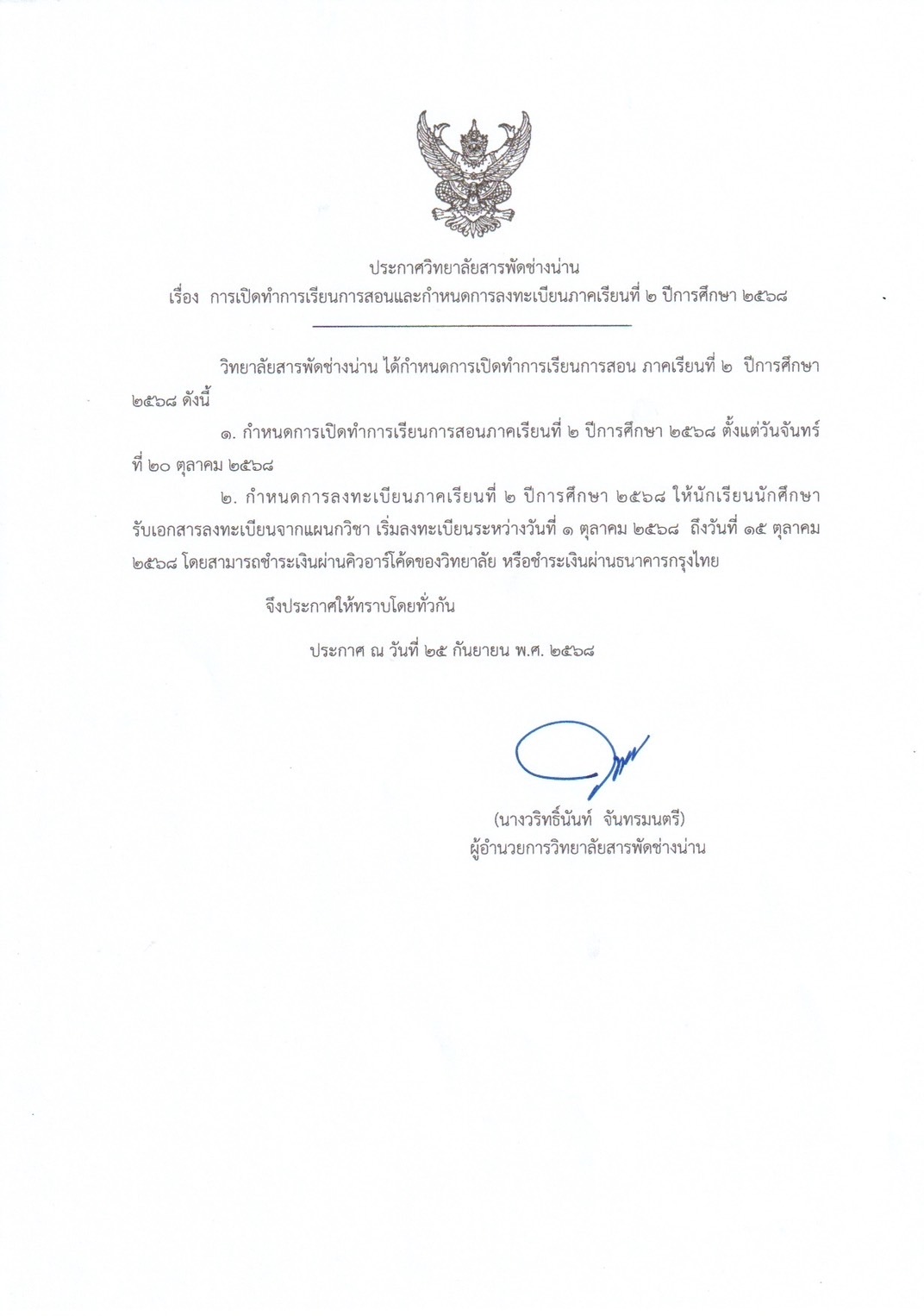 ประกาศวิทยาลัยสารพัดช่างน่าน เรื่อง การเปิดทำการเรียนการสอนและกำหนดการลงทะเบียน ภาคเรียนที่ 2 ปีการศึกษา 2568