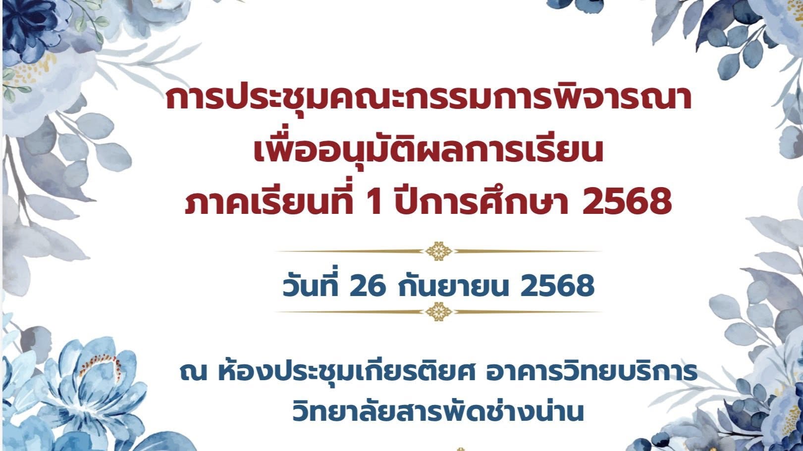 วันศุกร์ ที่ 26 กันยายน 2568 วิทยาลัยสารพัดช่างน่าน ดำเนินการประชุมคณะกรรมการพิจารณาเพื่ออนุมัติผลการเรียน ภาคเรียนที่ 1 ปีการศึกษา 2568 ณ ห้องประชุมเกียรติยศ อาคารวิทยบริการ วิทยาลัยสารพัดช่างน่าน