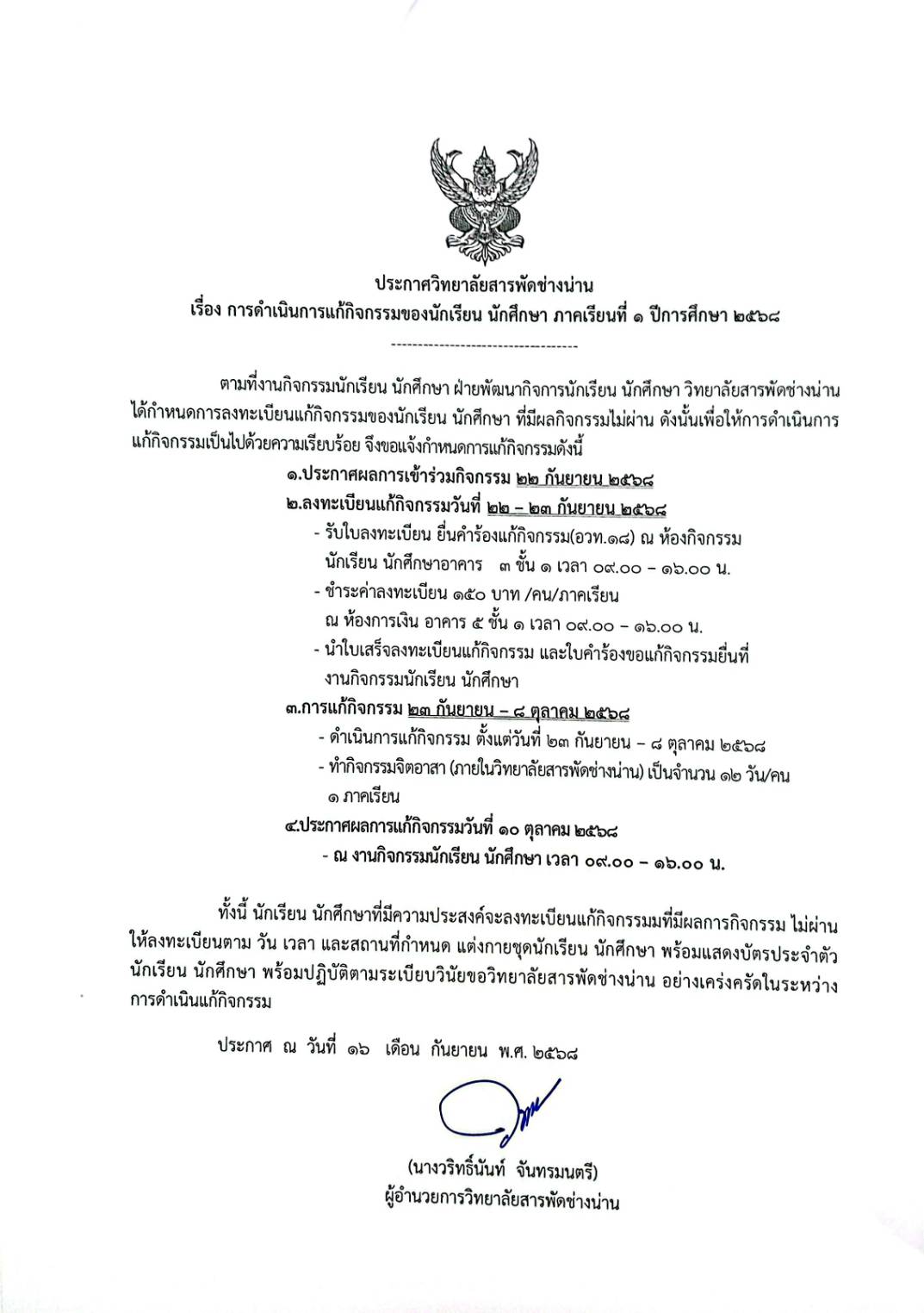 ประกาศวิทยาลัยสารพัดช่างน่าน เรื่อง การดำเนินการแก้กิจกรรมของนักเรียน นักศึกษา ภาคเรียนที่ 1 ปีการศึกษา 2568
