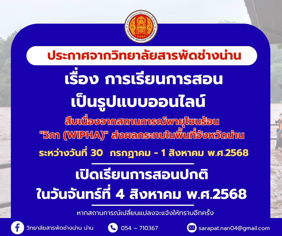 ประกาศจากวิทยาลัยสารพัดช่างน่าน เรื่องการจัดเรียนการสอน Online สืบเนื่องจากสถานการณ์พายุโซนร้อน "วิภา (WIPHA)" ส่งผลกระทบในพื้นที่จังหวัดน่าน