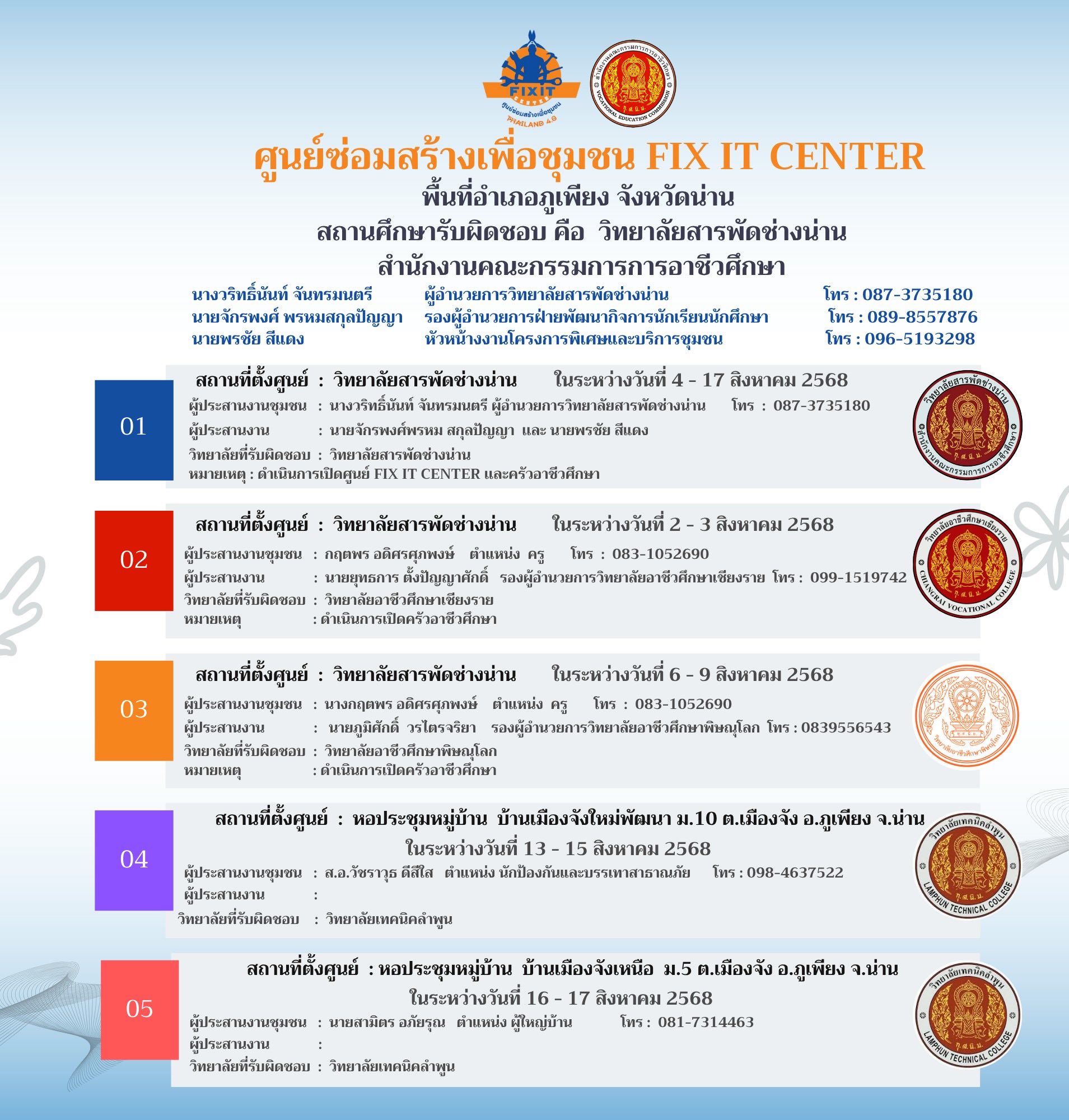 สำนักงานคณะกรรมการการอาชีวศึกษา โดย...สถานศึกษาอาชีวศึกษาภาคเหนือ เปิดบริการศูนย์ซ่อมสร้างเพื่อชุมชน Fix It Center ระหว่างวันที่ 4 - 17 สิงหาคม 2568 ศูนย์ซ่อมสร้างเพื่อชุมชน FIX IT CENTER พื้นที่อำเภอภูเพียง จังหวัดน่าน สถานศึกษารับผิดชอบคือ วิทยาลัยสารพัดช่างน่าน สำนักงานคณะกรรมการการอาชีวศึกษา ตารางกำหนดการลงพื้นที่ให้บริการ ตรวจซ่อมรถ กรยานยนต์ เครื่องใช้ไฟฟ้า และเครื่องยนต์เล็ก ที่ชำรุดหรือได้รับผลกระทบจากน้ำท่วม ฟรี ตามจุดนัดหมายที่แนบมาพร้อมนี้