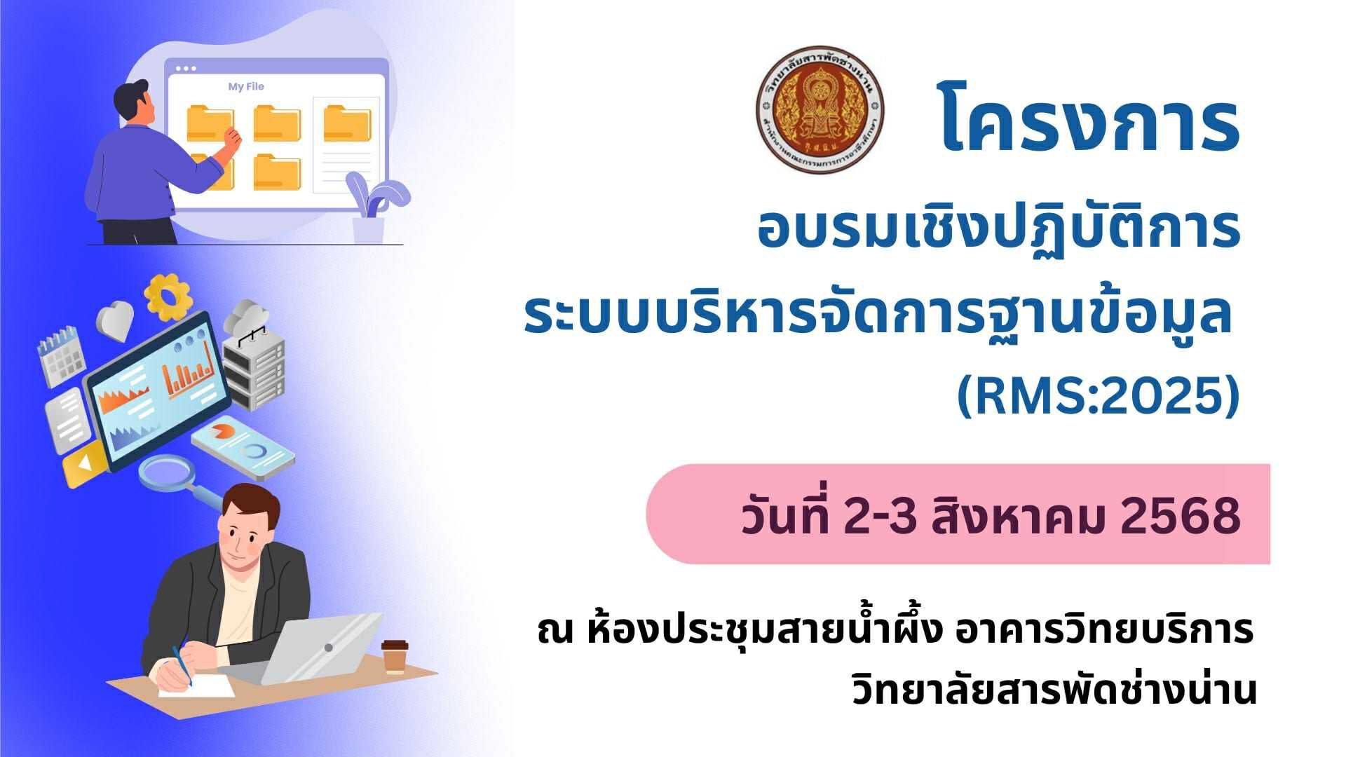 วิทยาลัยสารพัดช่างน่านดำเนินโครงการ“การอบรมเชิงปฏิบัติการระบบบริหารจัดการฐานข้อมูลสถานศึกษา (RMS:2025)” ภายใต้โครงการพัฒนาศักยภาพครูและบุคลากรทางการศึกษา ปีงบประมาณ พ.ศ.2568 ในระหว่างวันที่ 2-3 สิงหาคม 2568 ณ ห้องประชุมสายน้ำผึ้ง อาคารวิทยบริการ วิทยาลัยสารพัดช่างน่าน วิทยากรโดย…นายจักรกฤษณ์ จันทร์รอด นายนัฐพล กล่ำคำ
