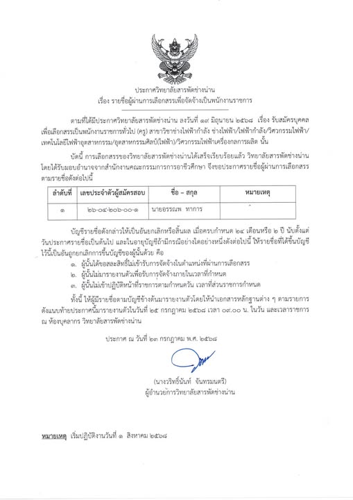 ประกาศวิทยาลัยสารพัดช่างน่าน เรื่อง รายชื่อผู้ผ่านการเลือกสรรเพื่อจัดจ้างเป็นพนักงานราชการทั่วไป (ครู) สาขาวิชาช่างไฟฟ้ากำลัง