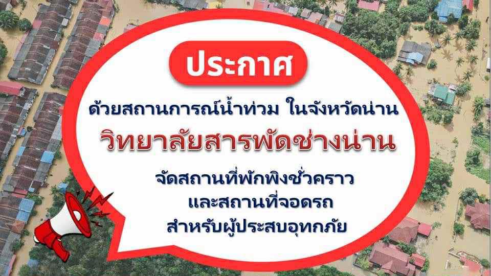 สถานการณ์น้ำท่วมจังหวัดน่าน วิทยาลัยสารพัดช่างน่าน ได้เตรียมจัดสถานที่พักพิงชั่วคราวสำหรับผู้ประสบอุทกภัย และสถานที่จอดรถยนต์ รถจักรยานยนต์ เบอร์โทร... ผอ.เติ้ล 0873735180