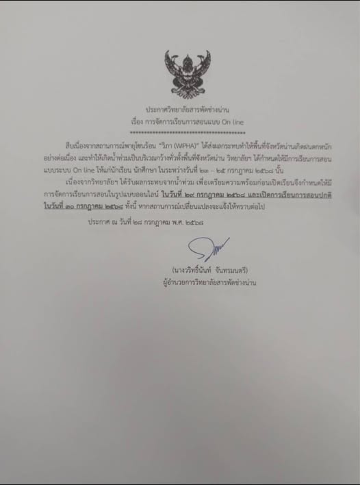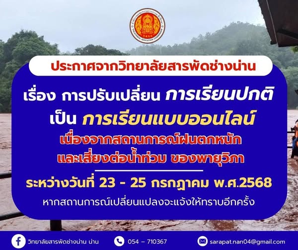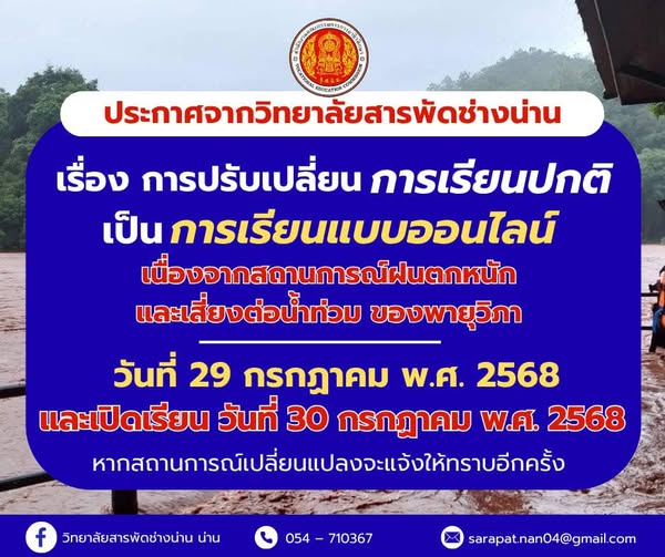 ประกาศจากวิทยาลัยสารพัดช่างน่าน เรื่องการปรับเปลี่ยน การเรียนปกติ เป็น การเรียนแบบออนไลน์ เนื่องจากสถานการณ์ฝนตกหนักและเสี่ยงต่อน้ำท่วมของพายุวิภา เรียนออนไลน์ 29 กรกฎาคม พ.ศ.2568 เปิดเรียน วันที่ 30 กรกฎาคม พ.ศ.2568