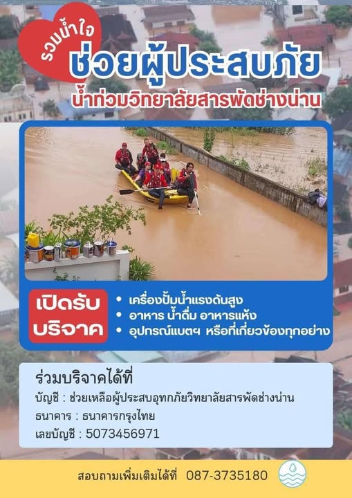 กราบขอบพระคุณ...ผู้ใจบุญ ที่ร่วมบริจาคเงินช่วยเหลือผู้ประสบภัยน้ำท่วม ชื่อบัญชี : ช่วยเหลือผู้ประสบอุทกภัย วิทยาลัยสารพัดช่างน่าน ธนาคารกรุงไทย เลขที่บัญชี 5073456971 วัตถุประสงค์ 1. จัดซื้อวัสดุอุปกรณ์จำเป็น ในการฟื้นฟู จากผลกระทบของอุทกภัยของวิทยาลัยสารพัดช่างน่าน 2. จัดทำอาหาร ในช่วงฟื้นฟู สำหรับผู้ได้รับผลกระทบจากอุทกภัย 3. ดำเนินกิจกรรมจิตอาสา ศูนย์ ซ่อม สร้าง ในการซ่อมบำรุงวัสดุอุปกรณ์ ที่โดนน้ำท่วม ฯลฯ