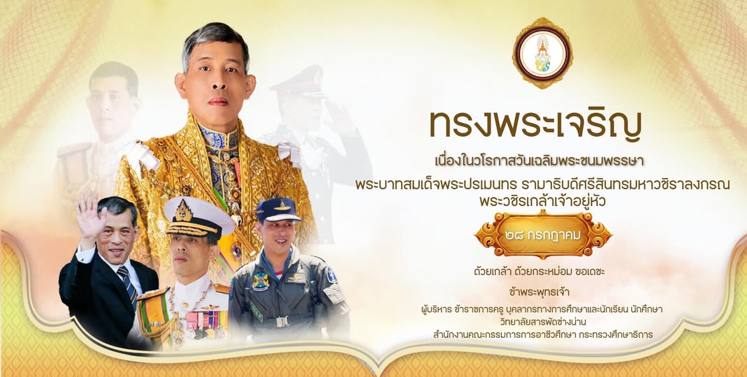 สำนักพระราชวัง ขอเชิญชวนประชาชนร่วมลงนามถวายพระพรชัยมงคล พระบาทสมเด็จพระเจ้าอยู่หัว เนื่องในโอกาสวันเฉลิมพระชนมพรรษา วันที่ ๒๘ กรกฎาคม ๒๕๖๘ ผ่านระบบออนไลน์ ที่เว็บไซต์หน่วยราชการในพระองค์ www.royaloffice.th ระหว่างวันที่ ๒๕ – ๓๑ กรกฎาคม ๒๕๖๘ ข้าพระพุทธเจ้า คณะผู้บริหาร คณะครู บุคคลากรและนักเรียน นักศึกษา วิทยาลัยสารพัดช่างน่าน