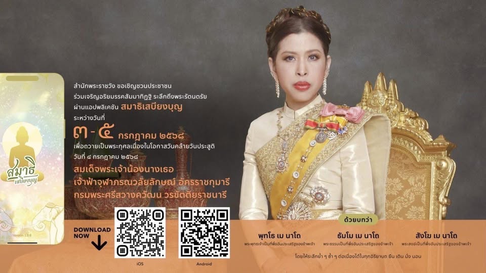 สำนักพระราชวัง ขอเชิญชวนประชาชนร่วมเจริญอริยมรรค “สัมมาทิฏฐิ” ระลึกถึงพระรัตนตรัย ว่าเป็นสรณะที่พึ่งที่ยึดถือ อันเป็นทางเป็นธรรมที่พระพุทธองค์ได้ทรงตรัสไว้โดยชอบ เพื่อถวายเป็นพระกุศล เนื่องในโอกาสวันคล้ายวันประสูติ สมเด็จพระเจ้าน้องนางเธอ เจ้าฟ้าจุฬาภรณวลัยลักษณ์ อัครราชกุมารี กรมพระศรีสวางควัฒน วรขัตติยราชนารี วันที่ ๔ กรกฏาคม ๒๕๖๘ ผ่านแอปพลิเคชัน “สมาธิเสบียง