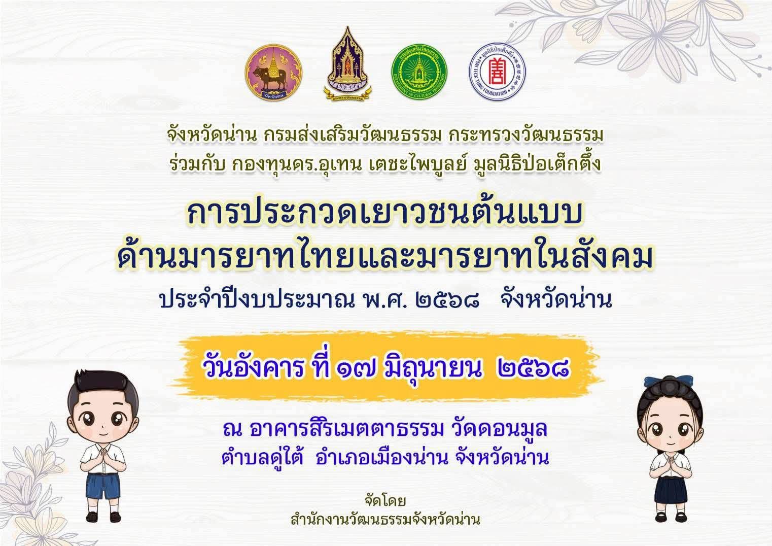 วันอังคารที่ 17 มิถุนายน 2568 นางสาวดวงดาว ไชยเขียว และนายชนินทร์ สีก๊ะ ครูผู้ควบคุม นำนักเรียนนักศึกษา วิทยาลัยสารพัดช่างน่าน ร่วมกิจกรรมการประกวดเยาวชนต้นแบบด้านมารยาทไทย และมารยาทในสังคม ประจำปีงบประมาณ พ.ศ. 2568 จังหวัดน่าน เพื่อเป็นแนวทางและเครื่องมือสำคัญในการเผยแพร่และเสริมสร้างความรู้ ความเข้าใจ หลักปฏิบัติ เรื่องมารยาทไทย และมารยาทในสังคม รวมทั้งการรณรงค์เผยแพร่ประชาสัมพันธ์การไหว้เป็นเอกลักษณ์ประจำชาติ ประเภทการทักทายและการแสดงความเคารพแบบไทย รวมทั้งเป็นการตอบสนองนโยบายและยุทธศาสตร์ชาติด้านการพัฒนาและเสริมสร้างศักยภาพทรัพยากรมนุษย์ โดยการปลูกฝังวัฒนธรรมและค่านิยมที่พึงประสงค์ประกวดเยาวชนต้นแบบด้านมารยาทไทย และมารยาทในสังคม