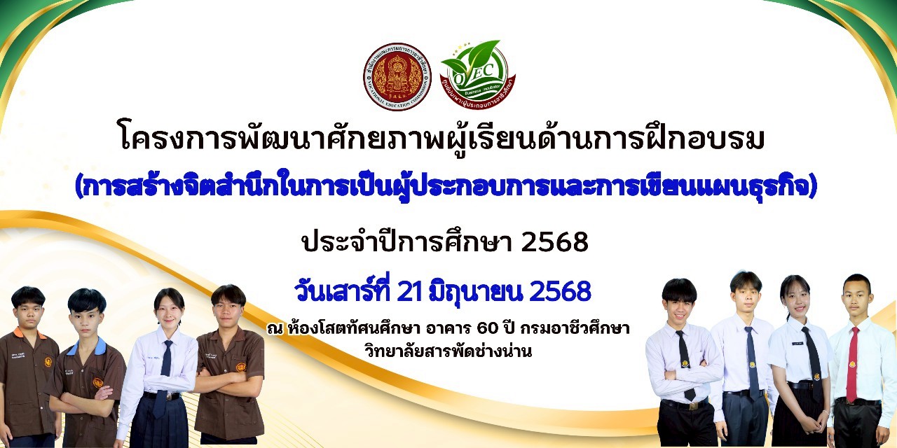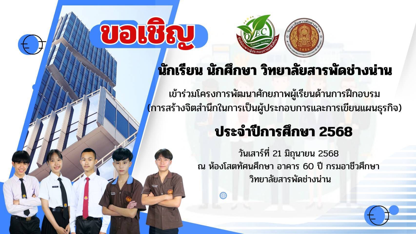 ขอเชิญนักเรียนนักศึกษา วิทยาลัยสารพัดช่างน่าน เข้าร่วมโครงการพัฒนาศักยภาพผู้เรียนด้านการฝึกอบรม (การสร้างจิตสำนึกในการเป็นผู้ประกอบการและการเขียนแผนธุรกิจ) ปีการศึกษา 2568 ในวันเสาร์ที่ 21 มิถุนายน 2568 ณ ห้องโสตทัศนศึกษาอาคาร 60 ปีกรมอาชีวศึกษาวิทยาลัยสารพัดช่างน่าน