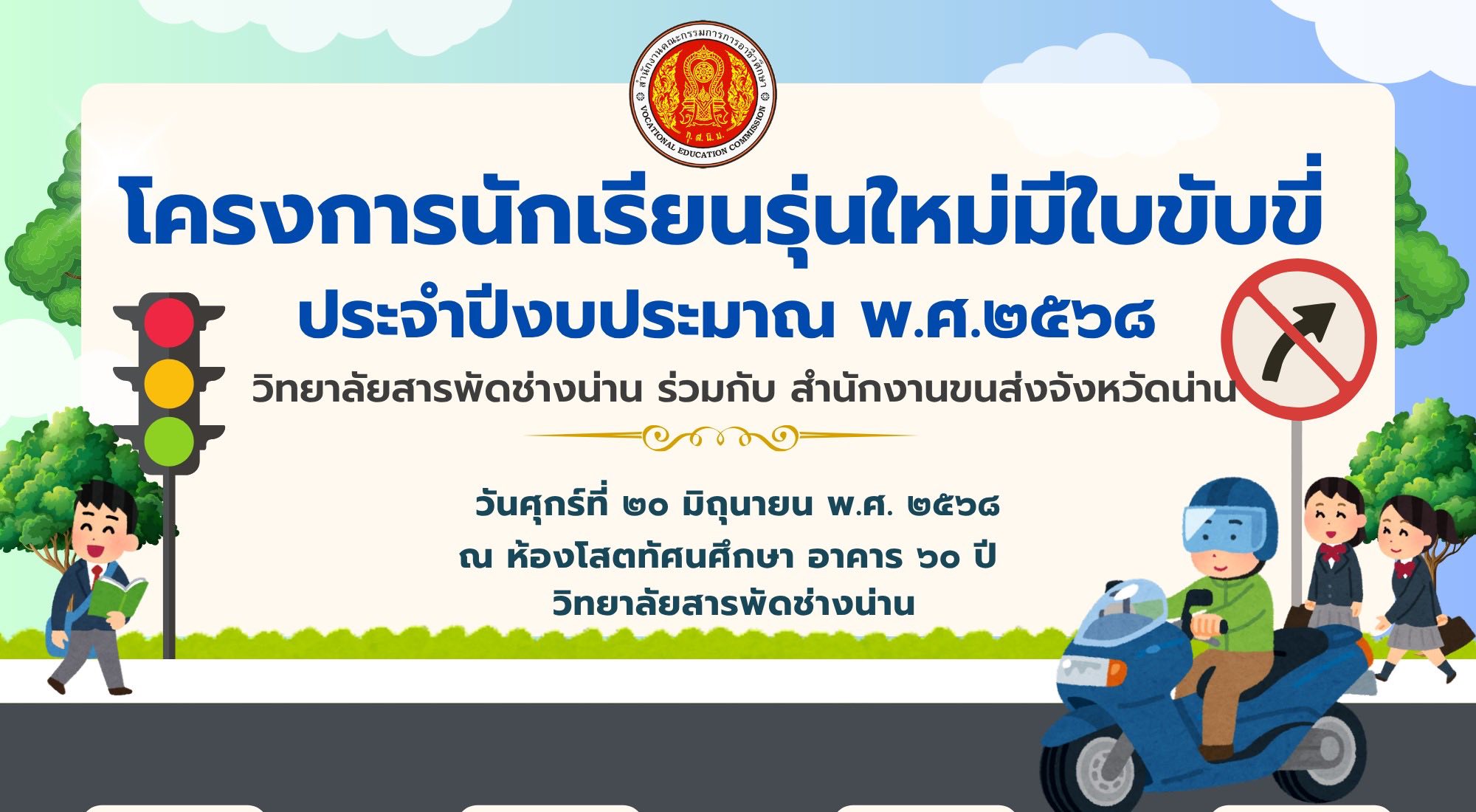 วันศุกร์ที่ 20 มิถุนายน 2568 วิทยาลัยสารพัดช่างน่าน ร่วมกับ ขนส่งจังหวัดน่าน ดำเนินโครงการ “นักเรียนรุ่นใหม่มีใบขับขี่" ประจำปีงบประมาณ 2568