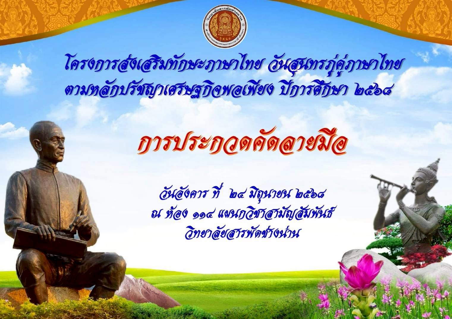วันอังคารที่ 24 มิถุนายน 2568 แผนกวิชาสามัญสัมพันธ์ดำเนินการประกวดคัดลายมือภาษาไทย ตามโครงการส่งเสริมทักษะภาษาไทย วันสุนทรภู่คู่ภาษาไทยตามหลักปรัชญาเศรษฐกิจพอเพียง ปีการศึกษา 2568