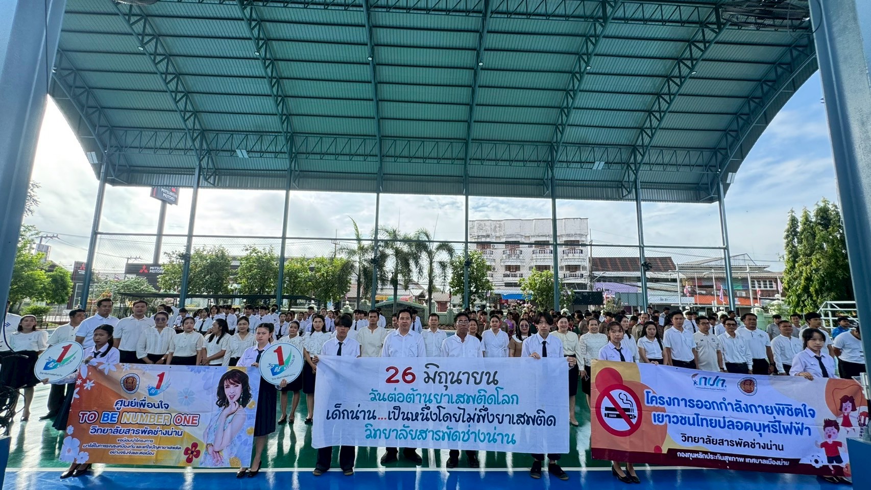 วันพฤหััสบดีที่ 26 มิถุนายน 2568 นายจักรพงศ์ พรหมสกุลปัญญา รองผู้อำนวยการวิทยาลัยสารพัดช่างน่าน พร้อมด้วย คณะผู้บริหาร คณะครู นักเรียน นักศึกษา วิทยาลัยสารพัดช่างน่าน ร่วมกิจกรรม วันต่อต้านยาเสพติดโลก ประจำปี 2568 "เด็กน่านเป็นหนึ่ง โดยไม่พึ่งยาเสพติด ณ วิทยาลัยสารพัดช่างน่าน