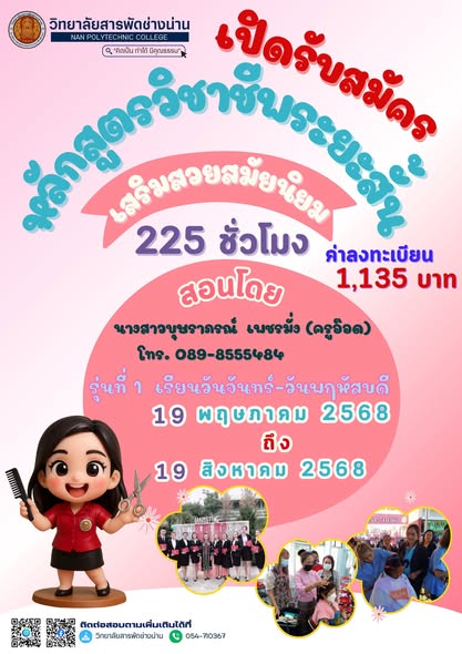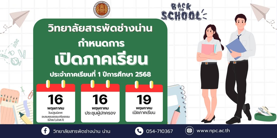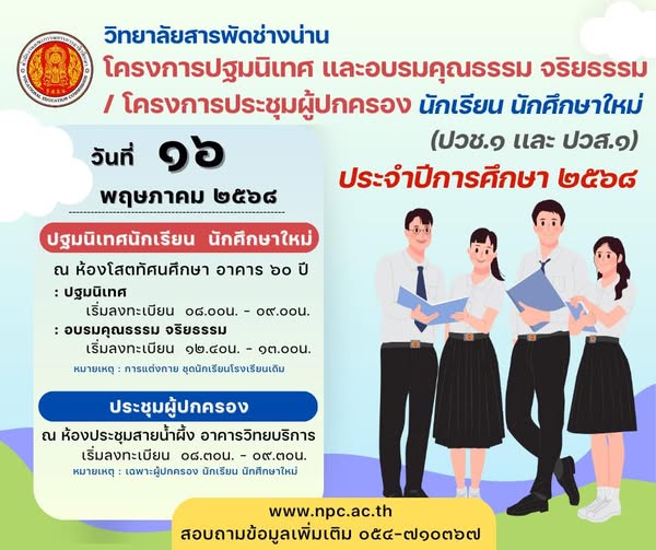 ประกาศจากวิทยาลัยสารพัดช่างน่าน เรื่อง กำหนดการโครงการปฐมนิเทศและอบรมคุณธรรมจริยธรรม/โครงการประชุมผู้ปกครอง นักเรียน นักศึกษาใหม่ และ กำหนดการเปิดภาคเรียน ประจำภาคเรียนที่ 1 ปีการศึกษา 2568