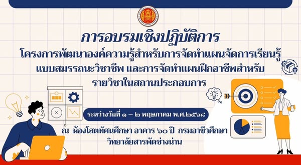 วันพฤหัสบดีที่ 1 พฤษภาคม 2568 วิทยาลัยสารพัดช่างน่าน ดำเนินการ "อบรมเชิงปฏิบัติการโครงการพัฒนาองค์ความรู้สำหรับการจัดทำแผนการจัดการเรียนรู้แบบสมรรถนะวิชาชีพ และการจัดทำแผนการฝึกอาชีพรายวิชาในสถานประกอบการ" ณ ห้องโสตทัศนศึกษา อาคาร 60 ปี กรมอาชีวศึกษา วิทยาลัยสารพัดช่างน่าน