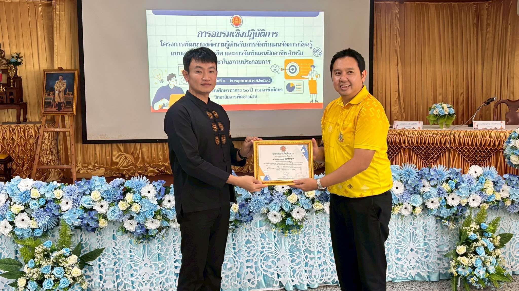 วันศุกร์ที่ 2 พฤษภาคม 2568 วิทยาลัยสารพัดช่างน่าน ดำเนินการ "อบรมเชิงปฏิบัติการโครงการพัฒนาองค์ความรู้สำหรับการจัดทำแผนการจัดการเรียนรู้แบบสมรรถนะวิชาชีพ และการจัดทำแผนการฝึกอาชีพรายวิชาในสถานประกอบการ" และมอบเกียรติบัตร ให้แก่วิทยากร ผู้ให้การอบรม และมอบวุฒิบัตร ให้แก่ผู้เข้ารับการอบรม ณ ห้องโสตทัศนศึกษา อาคาร 60 ปี กรมอาชีวศึกษา วิทยาลัยสารพัดช่างน่าน