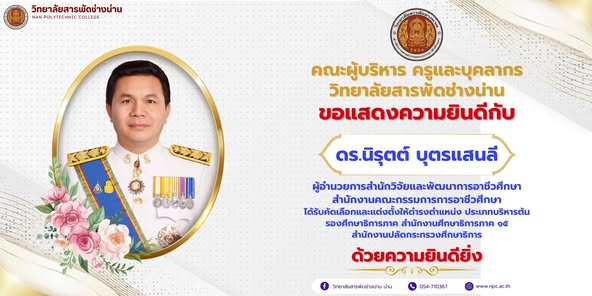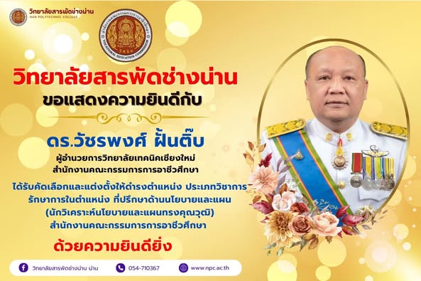 วิทยาลัยสารพัดช่างน่าน ขอแสดงความยินดีกับ ดร.วัชรพงศ์ ฝั้นติ๊บ ผู้อำนวยการวิทยาลัยเทคนิคเชียงใหม่