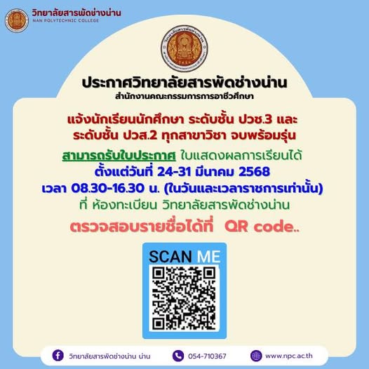 ประกาศ วิทยาลัยสารพัดช่างน่าน แจ้งนักเรียน ระดับชั้น ปวช.3 และ นักศึกษา ระดับชั้น ปวส.2 ทุกสาขาวิชา จบพร้อมรุ่น สามารถรับใบประกาศ ใบแสดงผลการเรียนได้ ตั้งแต่วันที่ 24-31 มีนาคม 2568 เวลา 08.30-16.30 น.(ในวันและเวลาราชการเท่านั้น) ที่ ห้องทะเบียน วิทยาลัยสารพัดช่างน่าน