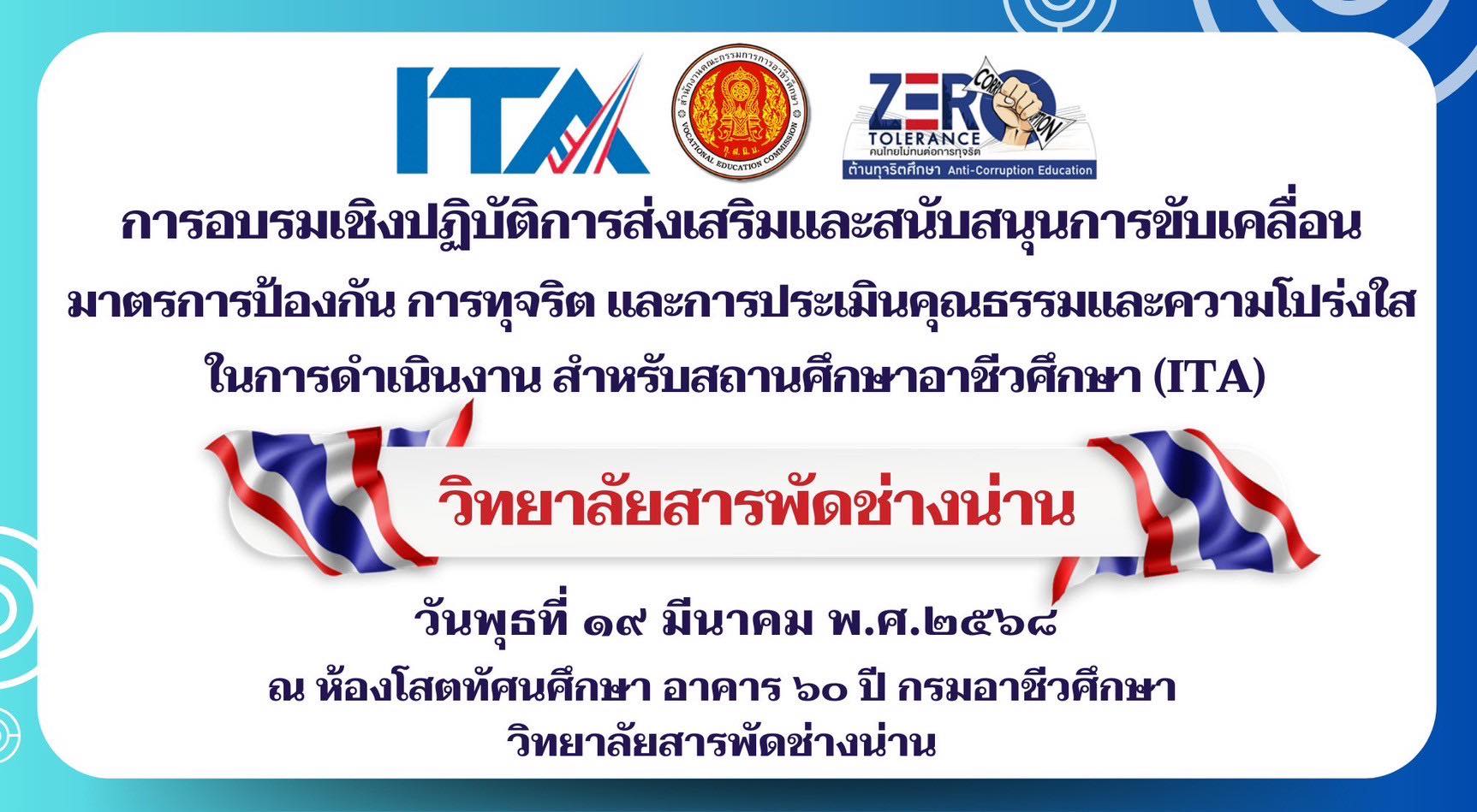 วันพุธที่ 18 มีนาคม 2568 วิทยาลัยสารพัดช่างน่าน ดำเนินการอบรมเชิงปฏิบัติการ ส่งเสริมและสนับสนุนการขับเคลื่อนมาตรการป้องกัน การทุจริตและการประเมินคุณธรรมและความโปร่งใสในการดำเนินงานสำหรับสถานศึกษาอาชีวศึกษา(ITA) ณ ห้องโสตทัศนศึกษา อาคาร 60 ปี กรมอาชีวศึกษา วิทยาลัยสารพัดช่างน่าน