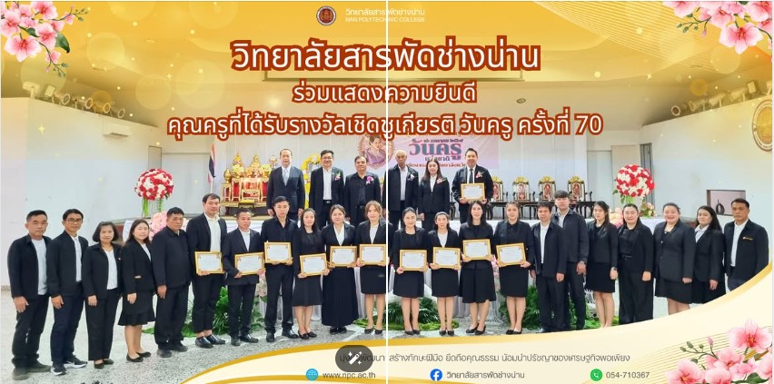 วิทยาลัยสารพัดช่างน่าน ร่วมแสดงความยินดีกับผู้บริหาร ครู และบุคลากรทางการศึกษา ผู้ได้รับรางวัลเชิดชูเกียรติ เนื่องในวันครู ครั้งที่ 70 พ.ศ. 2569 วิทยาลัยสารพัดช่างน่าน นำโดย นายนิพนธ์ ร่องพืช รองผู้อำนวยการวิทยาลัยสารพัดช่างน่าน พร้อมด้วยคณะครูและบุคลากรทางการศึกษา เข้าร่วมพิธีวันครู ครั้งที่ 70 พ.ศ. 2569 ณ ห้องประชุมวิศณุรักษณ์ วิทยาลัยเทคนิคน่าน โดยมี ว่าที่ร้อยตรี สมเดช อภิชยกุล ให้เกียรติเป็นประธานในพิธี ภายในงานมีการประกอบพิธีเจริญพระพุทธมนต์เพื่อความเป็นสิริมงคล และพิธีมอบรางวัลเชิดชูเกียรติแก่ผู้บริหาร ครู และบุคลากรทางการศึกษา ผู้มีผลงานดีเด่นด้านต่าง ๆ จากสถานศึกษาอาชีวศึกษาในจังหวัดน่านรวม 4 วิทยาลัย ท่ามกลางบรรยากาศแห่งความภาคภูมิใจและความอบอุ่นของชาวการศึกษา
