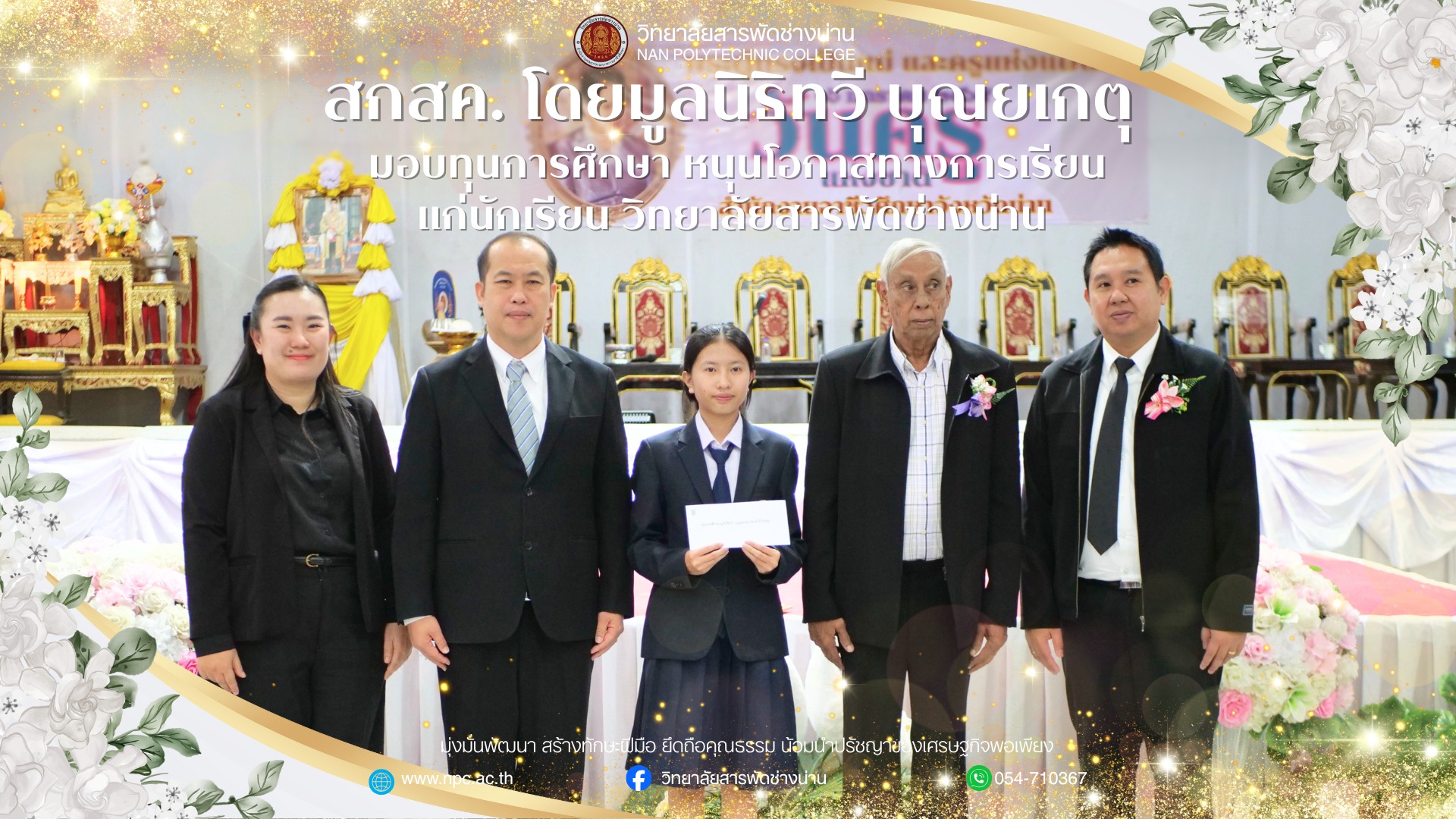 สกสค. โดยมูลนิธิทวี บุณยเกตุ มอบทุนการศึกษา หนุนโอกาสทางการเรียนแก่นักเรียนอาชีวศึกษา สำนักงานคณะกรรมการ สกสค. โดย มูลนิธิทวี บุณยเกตุ ได้มอบทุนการศึกษา ประจำปีการศึกษา ๒๕๖๘ เพื่อส่งเสริมและสนับสนุนโอกาสทางการศึกษาให้แก่นักเรียนที่มีความประพฤติดีและตั้งใจศึกษาเล่าเรียน โดยในโอกาสนี้ นางสาวจินดาลักษณ์ ตระกลทรัพย์ดี นักเรียนสาขาวิชาการบัญชี ระดับชั้นประกาศนียบัตรวิชาชีพชั้นปีที่ ๒ (ปวช.๒) วิทยาลัยสารพัดช่างน่าน ได้รับคัดเลือกให้เป็นผู้รับทุนการศึกษาดังกล่าว โดยได้รับเกียรติจาก ดร.ศศิรินทร์ มหาวงศนันท์ ผู้อำนวยการวิทยาลัยการอาชีพเวียงสา เป็นผู้แทนในการมอบทุน ณ ห้องประชุมวิศณุรักษณ์ วิทยาลัยเทคนิคน่าน