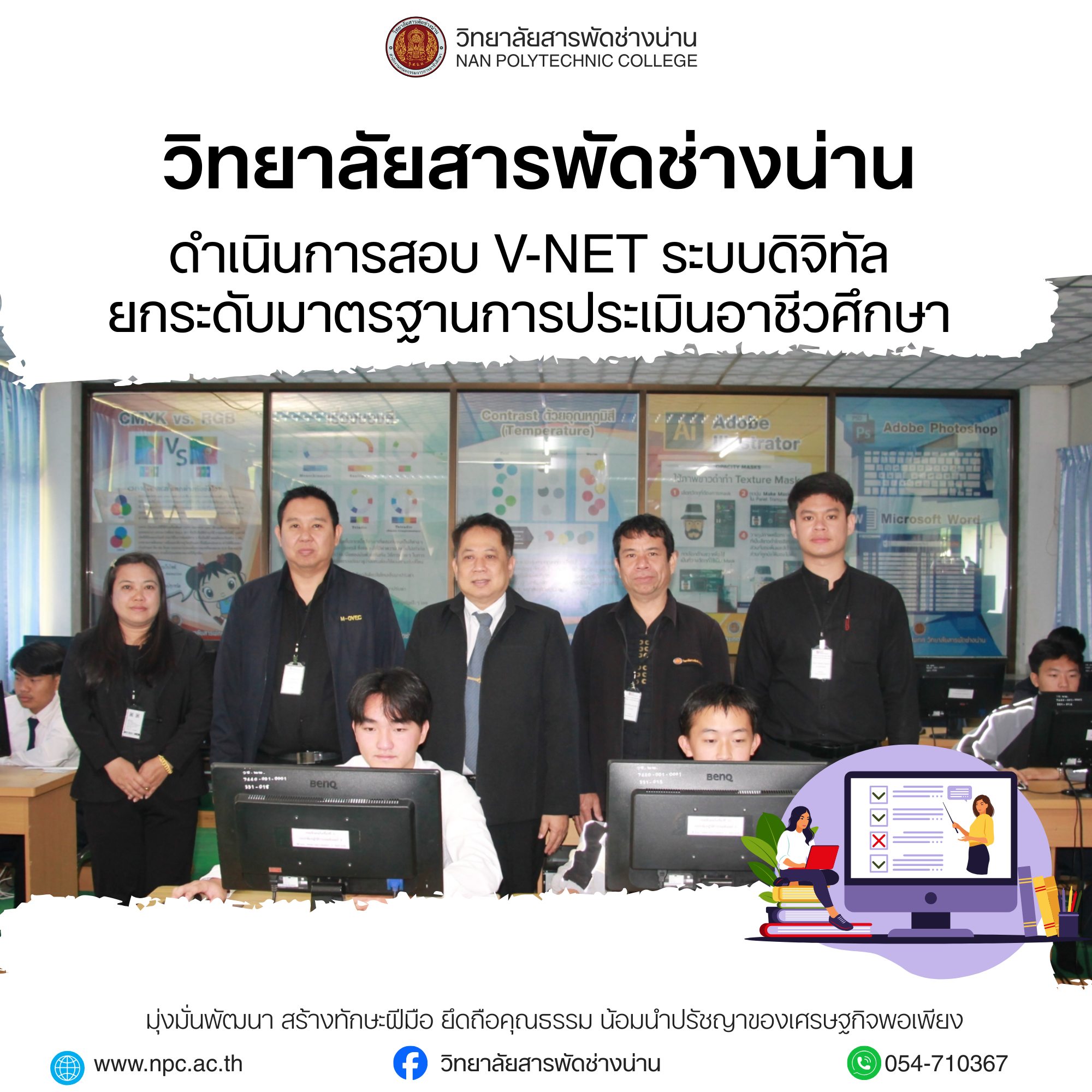 วันที่ 17 มกราคม พ.ศ. 2569 วิทยาลัยสารพัดช่างน่าน ได้ดำเนินการจัดการทดสอบทางการศึกษาระดับชาติด้านอาชีวศึกษา (V-NET) ด้วยระบบ Digital Testing ประจำปีการศึกษา 2568 ให้แก่นักเรียนระดับประกาศนียบัตรวิชาชีพ (ปวช.) ชั้นปีที่ 3 ตามนโยบายของสำนักงานคณะกรรมการการอาชีวศึกษา เพื่อยกระดับคุณภาพการวัดและประเมินผลทางการศึกษาให้มีมาตรฐานในระดับประเทศ