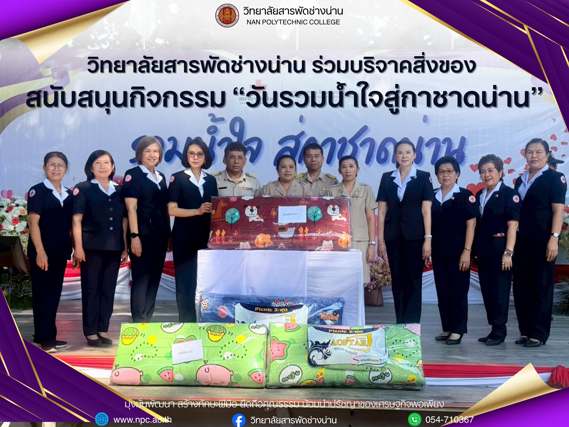 วิทยาลัยสารพัดช่างน่าน ร่วมบริจาคสิ่งของและสมทบทุน สนับสนุนกิจกรรม “วันรวมน้ำใจสู่กาชาดน่าน” วิทยาลัยสารพัดช่างน่าน ร่วมแสดงพลังแห่งการให้และจิตอาสา ด้วยการบริจาคสิ่งของอุปโภคบริโภคและสมทบทุน เพื่อสนับสนุนการจัดหารายได้ให้แก่เหล่ากาชาดจังหวัดน่าน ในกิจกรรม “วันรวมน้ำใจสู่กาชาดน่าน” ซึ่งจัดขึ้นเพื่อระดมทรัพยากรนำไปใช้ในภารกิจด้านสาธารณกุศล การช่วยเหลือผู้ประสบภัย ผู้ด้อยโอกาส และกิจกรรมเพื่อสังคมในพื้นที่จังหวัดน่าน