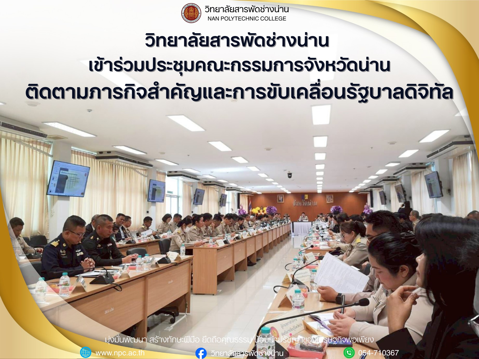 วิทยาลัยสารพัดช่างน่าน เข้าร่วมประชุมคณะกรมการจังหวัดน่าน ติดตามภารกิจสำคัญและการขับเคลื่อนรัฐบาลดิจิทัล วันที่ 26 มกราคม 2569 เวลา 09.30 น. ณ ห้องประชุมพระเจ้าสุริยพงษ์ผริตเดช ชั้น 3 ศาลากลางจังหวัดน่าน นายชัยนรงค์ วงศ์ใหญ่ ผู้ว่าราชการจังหวัดน่าน เป็นประธานการประชุมคณะกรรมการจังหวัดและหัวหน้าส่วนราชการจังหวัดน่าน ประจำเดือนมกราคม 2569 ในการนี้ วิทยาลัยสารพัดช่างน่าน มอบหมายให้ นายวิทยา ปันโน ครูชำนาญการพิเศษ ปฏิบัติหน้าที่รองผู้อำนวยการฝ่ายพัฒนากิจการนักเรียน นักศึกษา เข้าร่วมประชุมในฐานะตัวแทนวิทยาลัย พร้อมด้วยรองผู้ว่าราชการจังหวัด หัวหน้าส่วนราชการ และหน่วยงานที่เกี่ยวข้อง