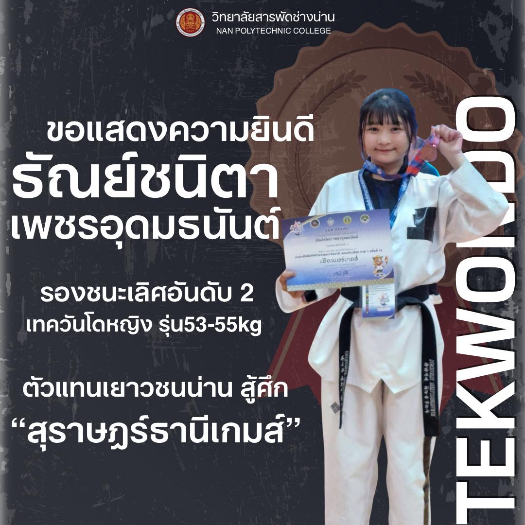 วิทยาลัยสารพัดช่างน่าน ขอแสดงความยินดีกับ นางสาวธัณย์ชนิตา เพชรอุดมธนันต์ (แก้ม) นักเรียน สาขาเทคโนโลยีสารสนเทศ นักกีฬาเทควันโดตัวแทน จังหวัดน่าน สังกัด “ริวเทควันโด” ที่สร้างผลงานอันน่าภาคภูมิใจ ในการแข่งขันกีฬาเยาวชนแห่งชาติ รอบคัดเลือกภาค 5 ครั้งที่ 41 “เมืองแพร่เกมส์” ซึ่งจัดขึ้นระหว่างวันที่ 25–30 มกราคม พ.ศ. 2569 ณ จังหวัดแพร่