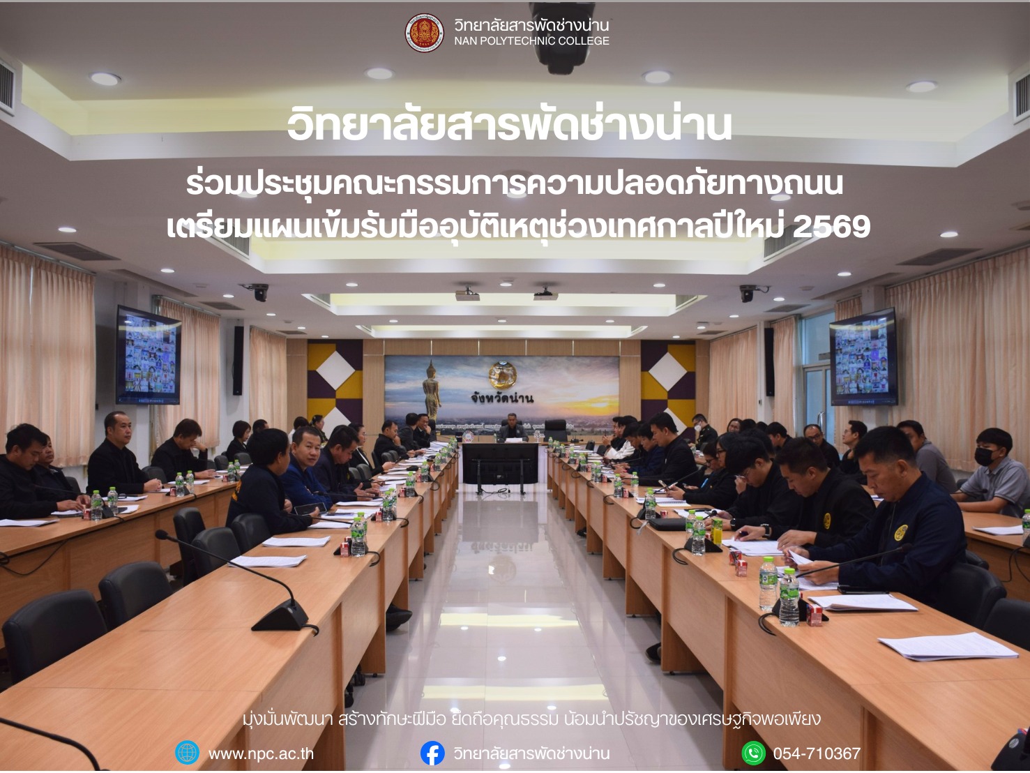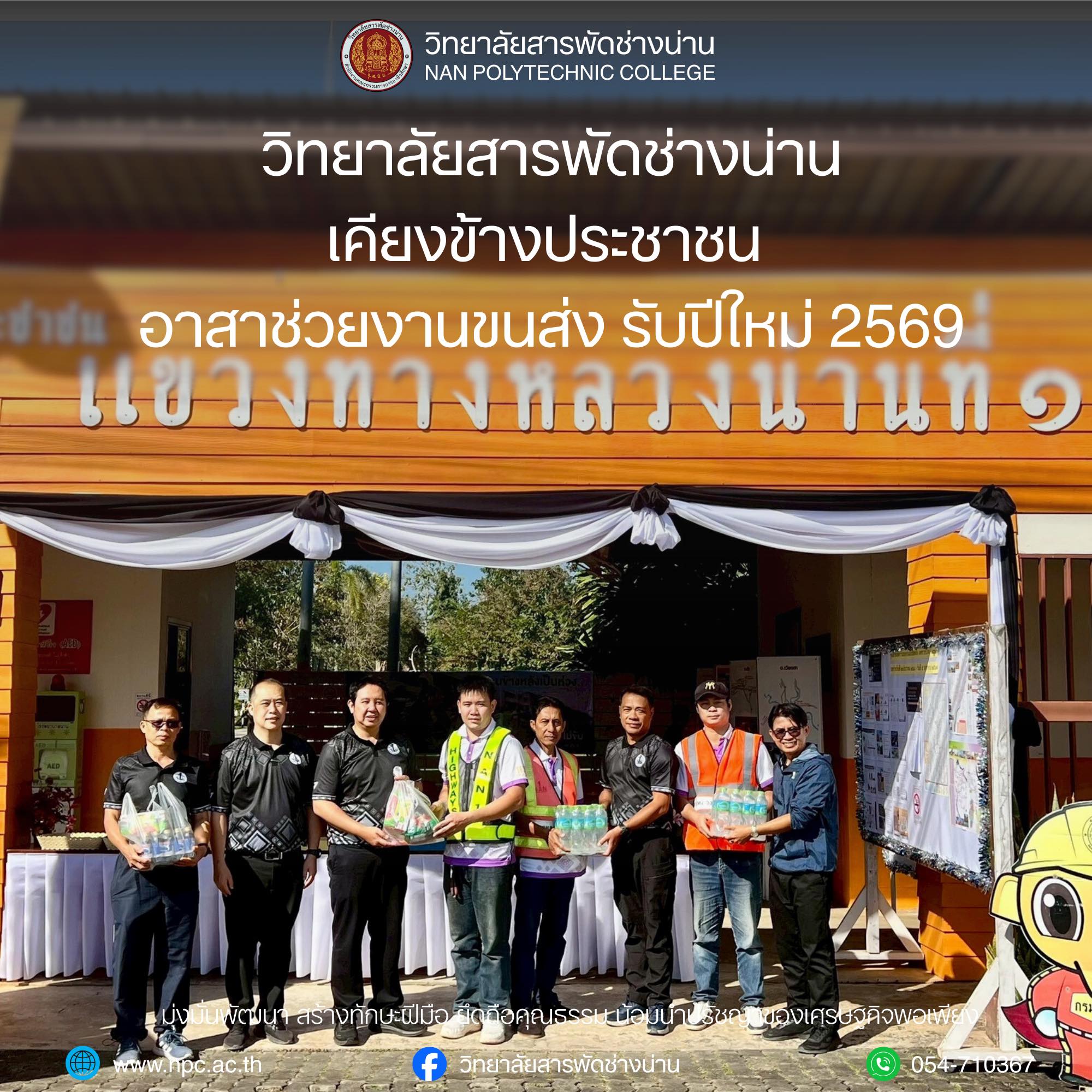 สารพัดช่างน่าน เคียงข้างประชาชน อาสาช่วยงานขนส่ง รับปีใหม่ 2569 เมื่อวันที่ 26 ธันวาคม 2568 นายนิพนธ์ ร่องพืช รองผู้อำนวยการวิทยาลัยสารพัดช่างน่าน พร้อมด้วยคณะครูและบุคลากรทางการศึกษา ได้เดินทางลงพื้นที่เพื่อ มอบของ ตรวจเยี่ยม และให้กำลังใจ แก่เจ้าหน้าที่ผู้ปฏิบัติงานประจำ จุดให้บริการแขวงทางหลวงน่านที่ 1 รวมถึงคณะทำงานของ วิทยาลัยเทคนิคน่าน ณ บริเวณด้านหน้า ห้างโลตัส น่าน
