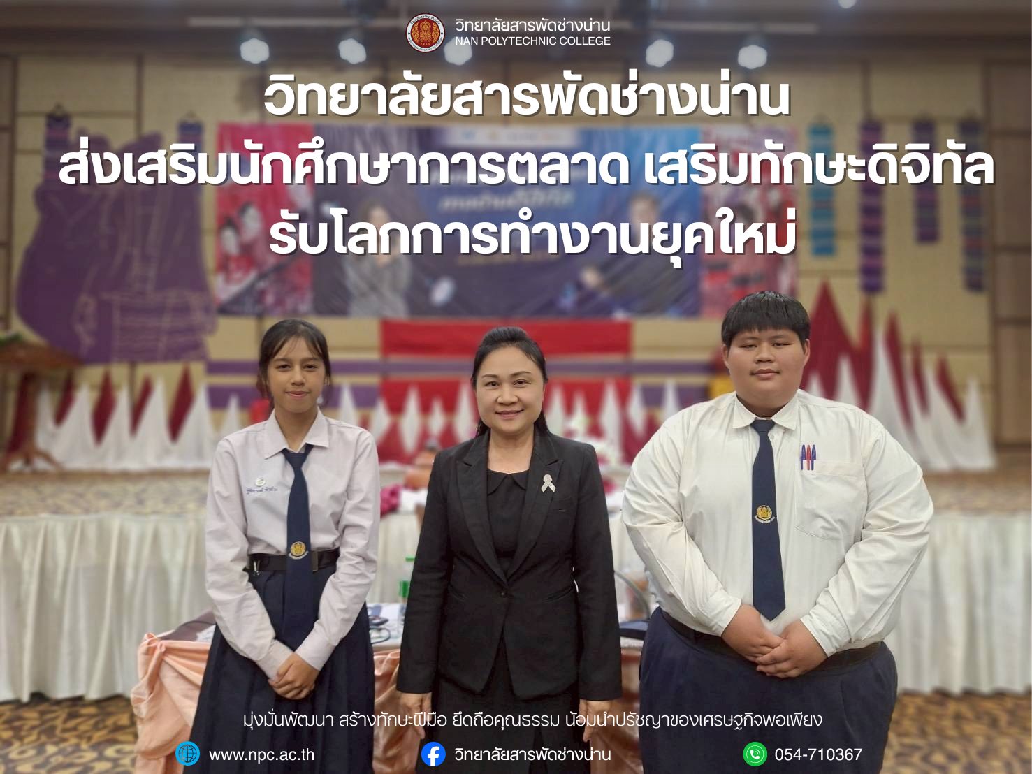 วิทยาลัยสารพัดช่างน่าน ส่งเสริมนักศึกษาการตลาด เสริมทักษะดิจิทัล รับโลกการทำงานยุคใหม่ นายจักรพงศ์ พรหมสกุลปัญญา รองผู้อำนวยการ รักษาการในตำแหน่งผู้อำนวยการวิทยาลัยสารพัดช่างน่าน ได้มอบหมายให้ นางอติกานต์ วิมลเกษม หัวหน้าแผนกวิชาการตลาด นำนักเรียนนักศึกษาแผนกวิชาการตลาด เข้าร่วม กิจกรรมการพัฒนาทักษะทางด้านดิจิทัล ประจำปีงบประมาณ 2559 เพื่อเสริมสร้างความรู้ ความเข้าใจ และเพิ่มศักยภาพด้านดิจิทัลให้สอดคล้องกับความต้องการของตลาดแรงงานในยุคดิจิทัล กิจกรรมดังกล่าวจัดขึ้นใน วันพฤหัสบดีที่ 18 และวันศุกร์ที่ 19 ธันวาคม 2568 ณ โรงแรมดิอิมเพรส จังหวัดน่าน โดยมุ่งเน้นการพัฒนาทักษะที่จำเป็นต่อการประกอบอาชีพด้านการตลาด อาทิ การใช้สื่อดิจิทัลเพื่อการสื่อสารทางการตลาด การสร้างเนื้อหาออนไลน์อย่างสร้างสรรค์ การปรับตัวต่อเทคโนโลยีใหม่ ๆ รวมถึงการเรียนรู้แนวคิดการทำงานในโลกธุรกิจยุคดิจิทัล การเข้าร่วมกิจกรรมในครั้งนี้ นับเป็นส่วนหนึ่งของแนวทางการจัดการเรียนการสอนของวิทยาลัยสารพัดช่างน่าน ที่ให้ความสำคัญกับการเรียนรู้จากประสบการณ์จริง ควบคู่กับการพัฒนาทักษะอาชีพและทักษะแห่งอนาคต เพื่อเตรียมความพร้อมให้นักเรียนนักศึกษาสามารถนำความรู้ไปประยุกต์ใช้ในการเรียน การทำงาน และการประกอบอาชีพได้อย่างมีประสิทธิภาพ อันจะนำไปสู่การพัฒนาศักยภาพของผู้เรียนอย่างยั่งยืนต่อไป ![]()