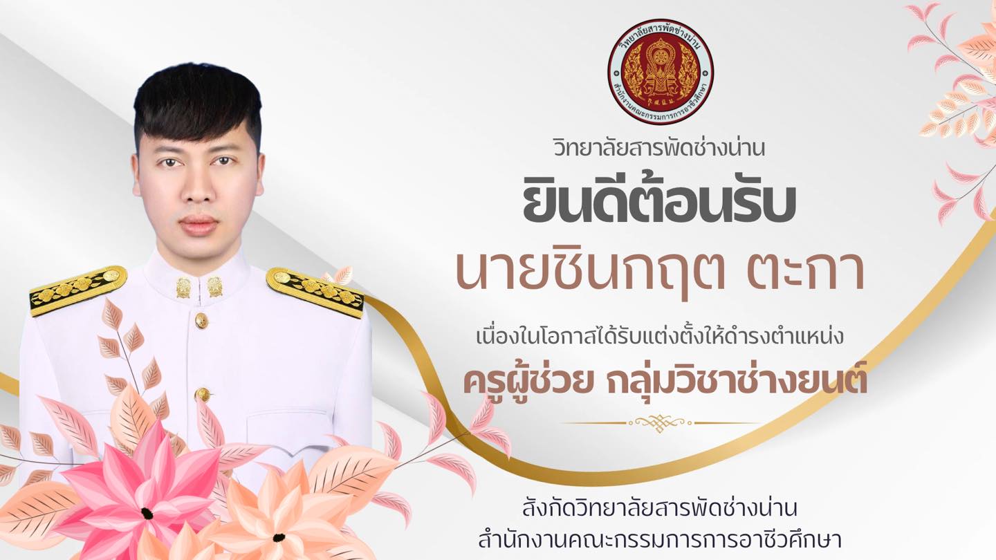 วิทยาลัยสารพัดช่างน่าน ขอแสดงความยินดีและยินดีต้อนรับ นายชินกฤต ตะกา ในโอกาสได้รับการบรรจุและแต่งตั้งเป็นข้าราชการครู ตำแหน่ง ครูผู้ช่วย กลุ่มวิชาช่างยนต์ สังกัดวิทยาลัยสารพัดช่างน่าน สำนักงานคณะกรรมการการอาชีวศึกษา วิทยาลัยสารพัดช่างน่าน มีความยินดีเป็นอย่างยิ่งที่ได้ต้อนรับบุคลากรที่มีความรู้ ความสามารถ และความมุ่งมั่นในการพัฒนาการจัดการเรียนการสอน เพื่อร่วมกันสร้างโอกาสทางการศึกษา พัฒนาผู้เรียนให้มีทักษะวิชาชีพ คุณธรรม และคุณภาพ พร้อมก้าวสู่อนาคตอย่างมั่นคง ![]()