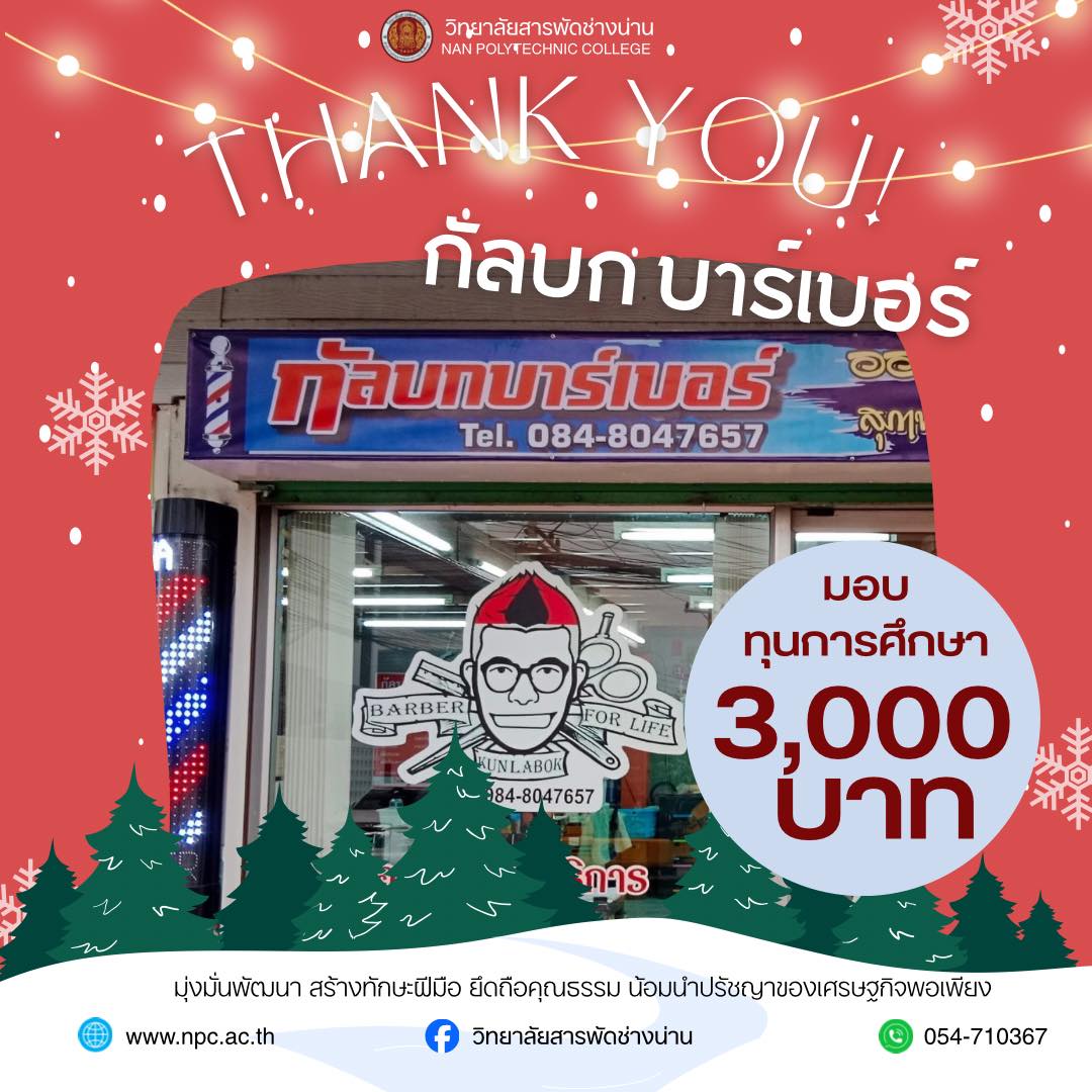 วิทยาลัยสารพัดช่างน่าน ขอขอบพระคุณผู้สนับสนุนทุนการศึกษา วิทยาลัยสารพัดช่างน่าน ขอขอบพระคุณ คุณสุรพล ไชยเสน จาก ร้านกัลบกบาร์เบอร์ (Kalbok Barber) ที่ได้กรุณามอบ ทุนการศึกษา จำนวน 3,000 บาท ให้แก่นักศึกษา เนื่องในกิจกรรม วันคริสต์มาส เพื่อเป็นขวัญและกำลังใจในการศึกษา และส่งเสริมโอกาสทางการเรียนรู้ของนักศึกษา วิทยาลัยสารพัดช่างน่าน ขอขอบพระคุณในน้ำใจและการสนับสนุนด้านการศึกษาในครั้งนี้ ซึ่งนับเป็นแบบอย่างที่ดีในการร่วมกันพัฒนาการศึกษาและเยาวชนของชาติ