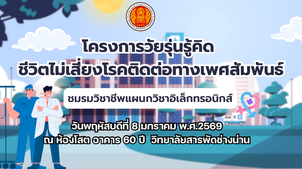 วิทยาลัยสารพัดช่างน่าน โดยแผนกวิชาอิเล็กทรอนิกส์ ได้จัดโครงการ “วัยรุ่นรู้คิด ชีวิตไม่เสี่ยงโรคติดต่อทางเพศสัมพันธ์” เพื่อส่งเสริมความรู้ ความเข้าใจ และทัศนคติที่ถูกต้องเกี่ยวกับการดูแลสุขภาวะทางเพศของวัยรุ่น ตลอดจนการป้องกันการมีเพศสัมพันธ์ที่ไม่พร้อมและการลดความเสี่ยงต่อโรคติดต่อทางเพศสัมพันธ์ ซึ่งเป็นประเด็นสำคัญที่ส่งผลต่อคุณภาพชีวิตและการพัฒนาศักยภาพของผู้เรียนในระยะยาว ในวันพฤหัสบดี ที่ 8 มกราคม 2569 เวลา 10.15-12.30น. ณ ห้องโสตทัศนศึกษา อาคาร 60 ปี วิทยาลัยสารพัดช่างน่าน